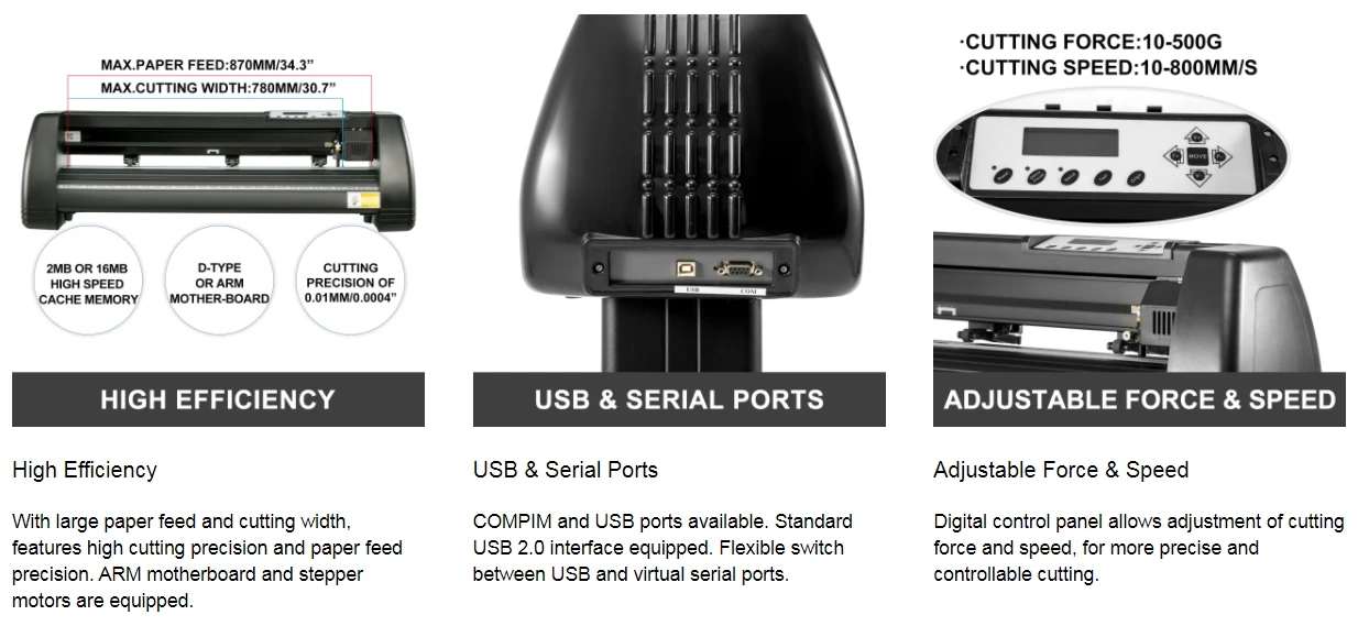 【CUTTING CAPACITY】-34-дюймовый виниловый резак с максимальной подачи бумаги 870 мм (34,3 "), максимальная ширина резки 780 мм (30,7"), точность резки +/-0,01 мм (0,0004 "), и подачи бумаги точность 3 м (118"). 【Сильная стабилизация 】-поддерживает системную плату d-типа и высокоскоростную память кэш-памяти 128K-2M. 2 прижимные ролики с двумя пружинами и алюминиевая втулка гарантируют, что подача бумаги не будет отклоняться на большое расстояние. 【Цифровой контроль-поставляется с ЖК-экраном с подсветкой и большой панелью управления. С регулировкой давления 10-500 г и скоростью резания 10-800 мм/сек. регулируется. 【Высокая Совместимость 】-Доступно с COMPIM и USB интерфейсом для более точного управления. Поддерживает язык DM/PL, HP/GL. Система: ПК на базе процессора Pentium или совместимый компьютер (Windows), Windows XP/Vista/7/8/10 (32 и 64). Не совместим с системой Mac. 【Широко использова】-Может использоваться в рекламной области, в различных декорациях, ручной работы, дополнительных для теплопередачи, изготовления этикеток и знаков и т. д.