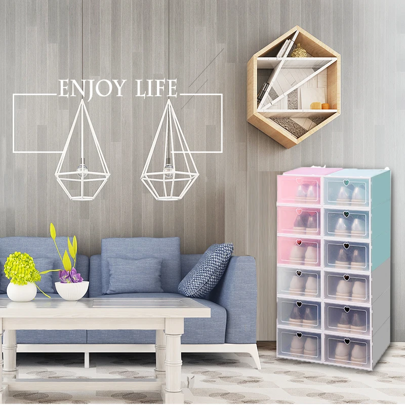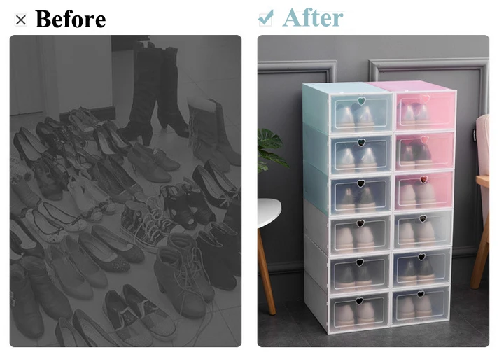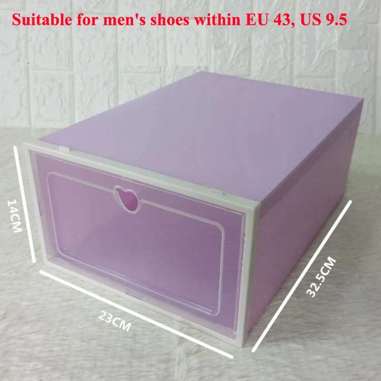 Особенности: 1. Удобно хранить обувь. 2. Прозрачный корпус коробки позволяет легко находить вещи. 3. Вы можете использовать несколько накладных для двойного пространства для хранения. 4. Большое отверстие для легкого доступа, утолщенная дверная рама, прочная, используется для длительного времени. Характеристики: Материал: Прочный Пластик (ПП) Размер коробки: 23x32,5x14 см (подходит для европейского размера 43, американского размера 9,5) Цвет: розовый, зеленый, фиолетовый, белый Упаковка включает: 1 шт. или 2 шт. пластиковая коробка для обуви