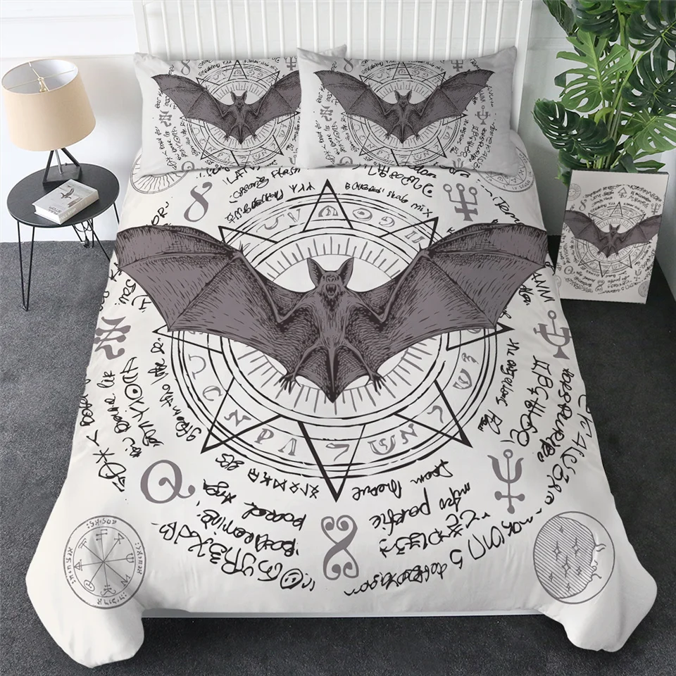 Название товара:Комплект постельного бельяУпаковочный лист:1 * пододеяльник + 2 * наволочкиТкань:ПолиэстерСезон:Весна, лето, осень, зимаОсобенности:Летающий вампир на фоне звезды и магические надписи. Дизайн Ночной летучей мыши особенно подходит для тех, кто любит научную фантастику и фантастические создания.Рекомендации по уходу за постельным бельем:1) Если для сочетания Вам дополнительно требуется простынь, пожалуйста, свяжитесь с нами.