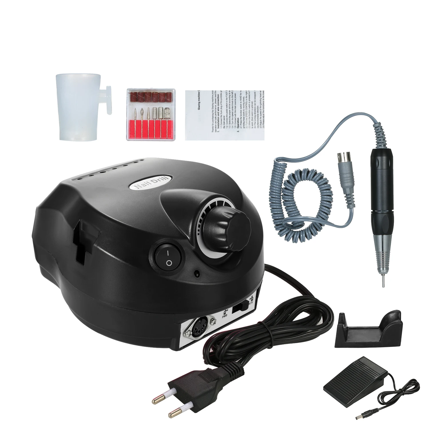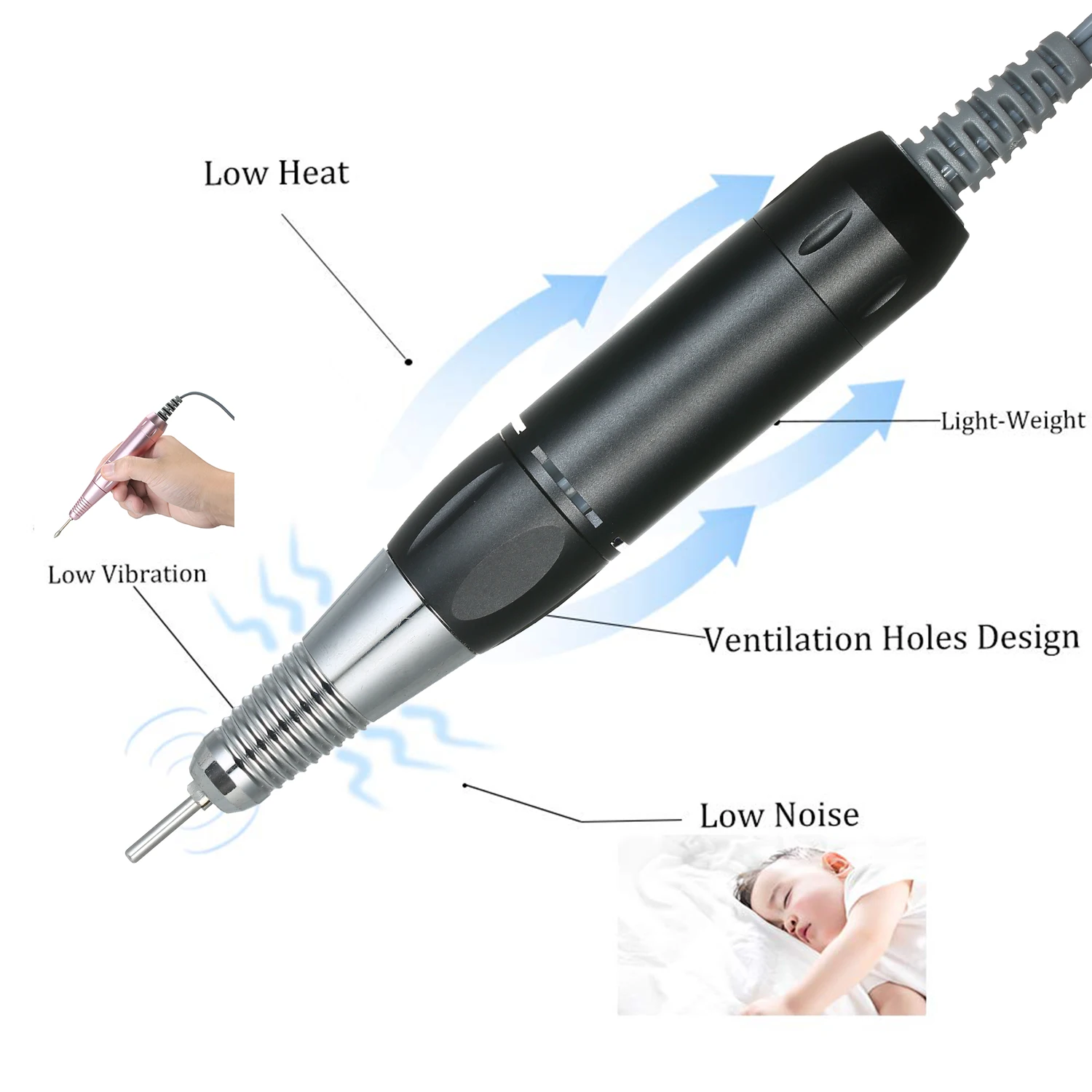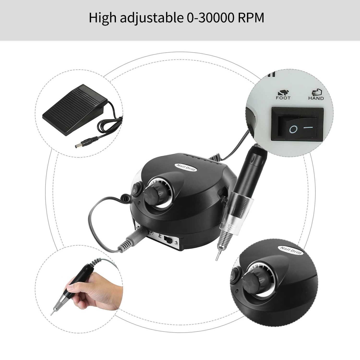 Профессиональная электрическая дрель для ногтей --- 0-30000r регулируемая скорость, вы можете выбрать скорость, которую вы хотите для различного использования. Низкий уровень шума, низкий нагрев и низкая вибрация, которые могут сделать вас комфортными при высокой скорости при использовании в салоне или дома.