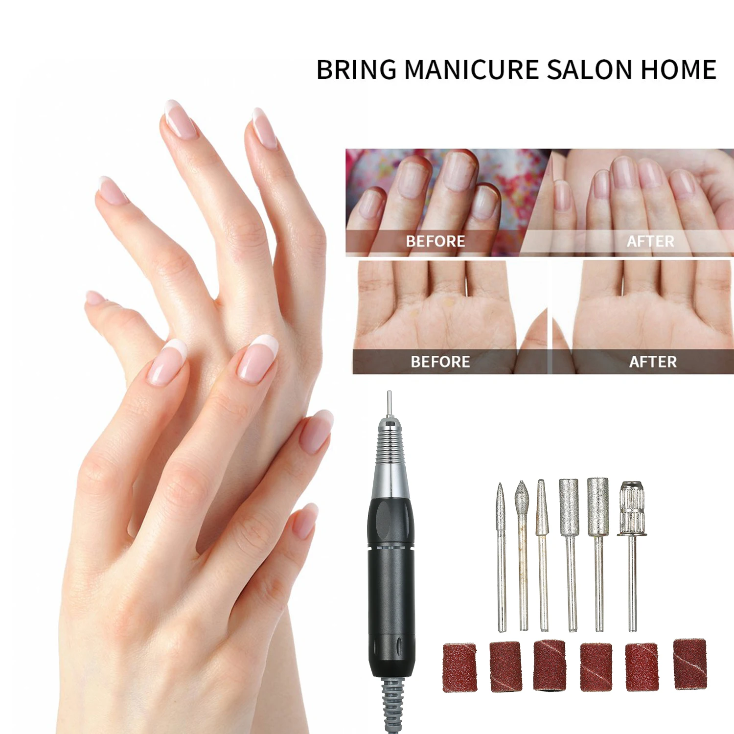 Многофункциональная дрель для ногтей --- 6 различных металлических сверл и 6 шлифовальных лент. Система закручивания может легко менять биты без инструментов. Идеально подходит для шлифования, резьбы, резки, полировки, удаления гель-лака и кутикулы для акриловых ногтей и натуральных ногтей.