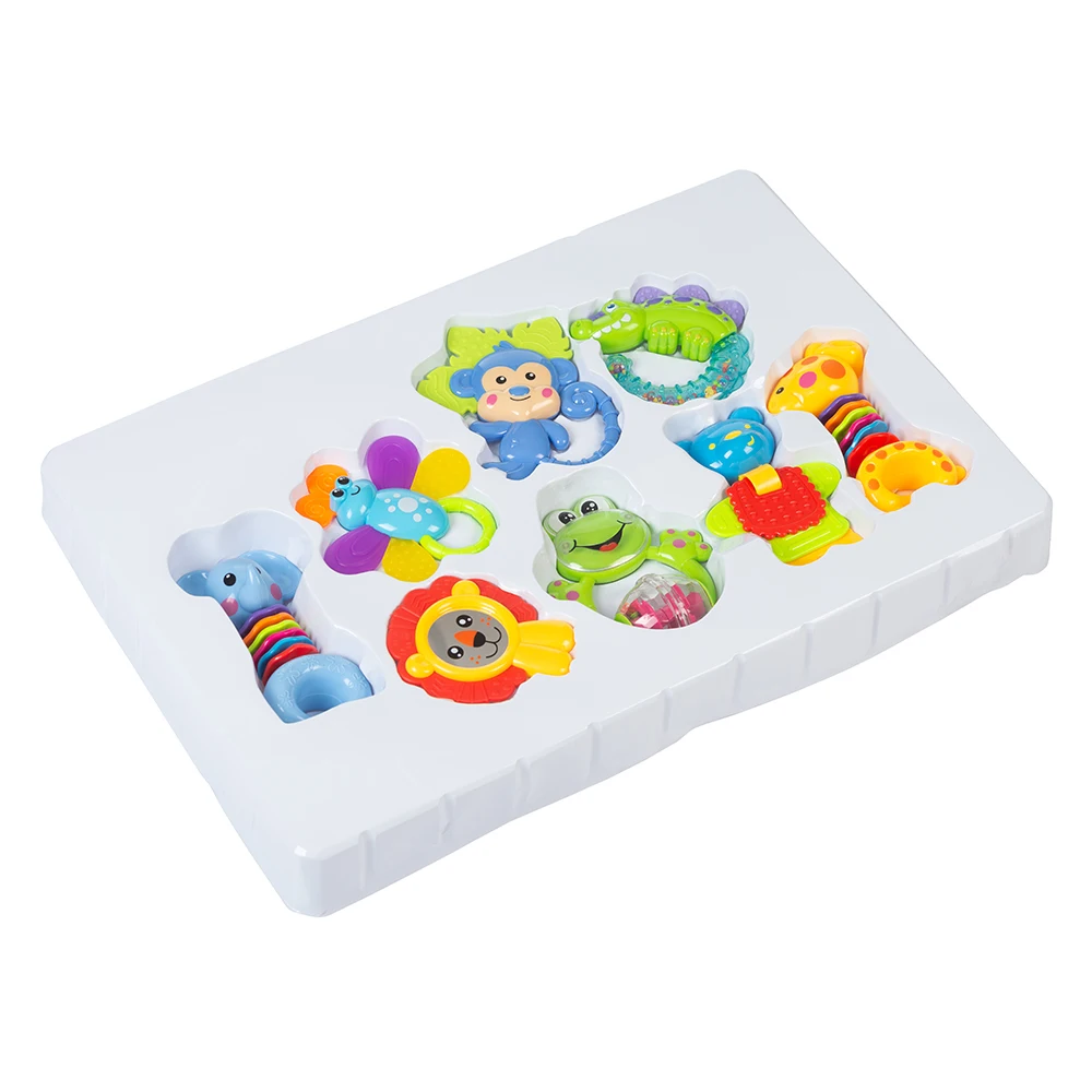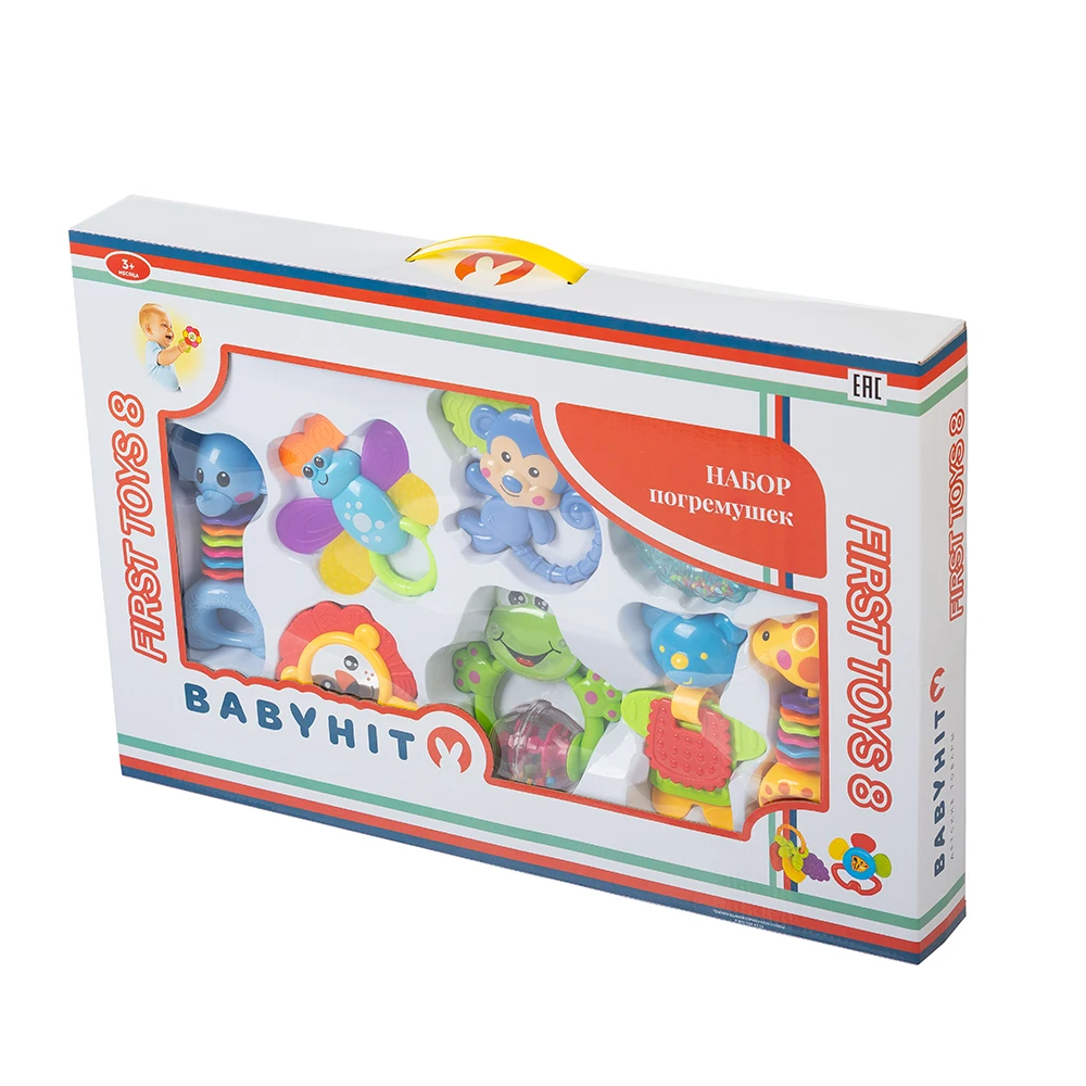 В наборе восемь игрушек: четыре погремушки (слоник, лягушка, медвежонок, жирафик) и четыре погремушки-прорезывателя (львенок, обезьянка, бабочка, крокодил).