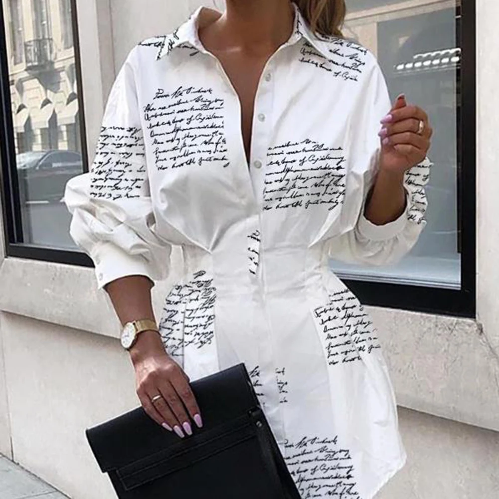 Женское платье-рубашка с отложным воротником, буквенным принтом, напечатанное слово, платье с длинными рукавами и высокой талией, элегантное платье на пуговицах