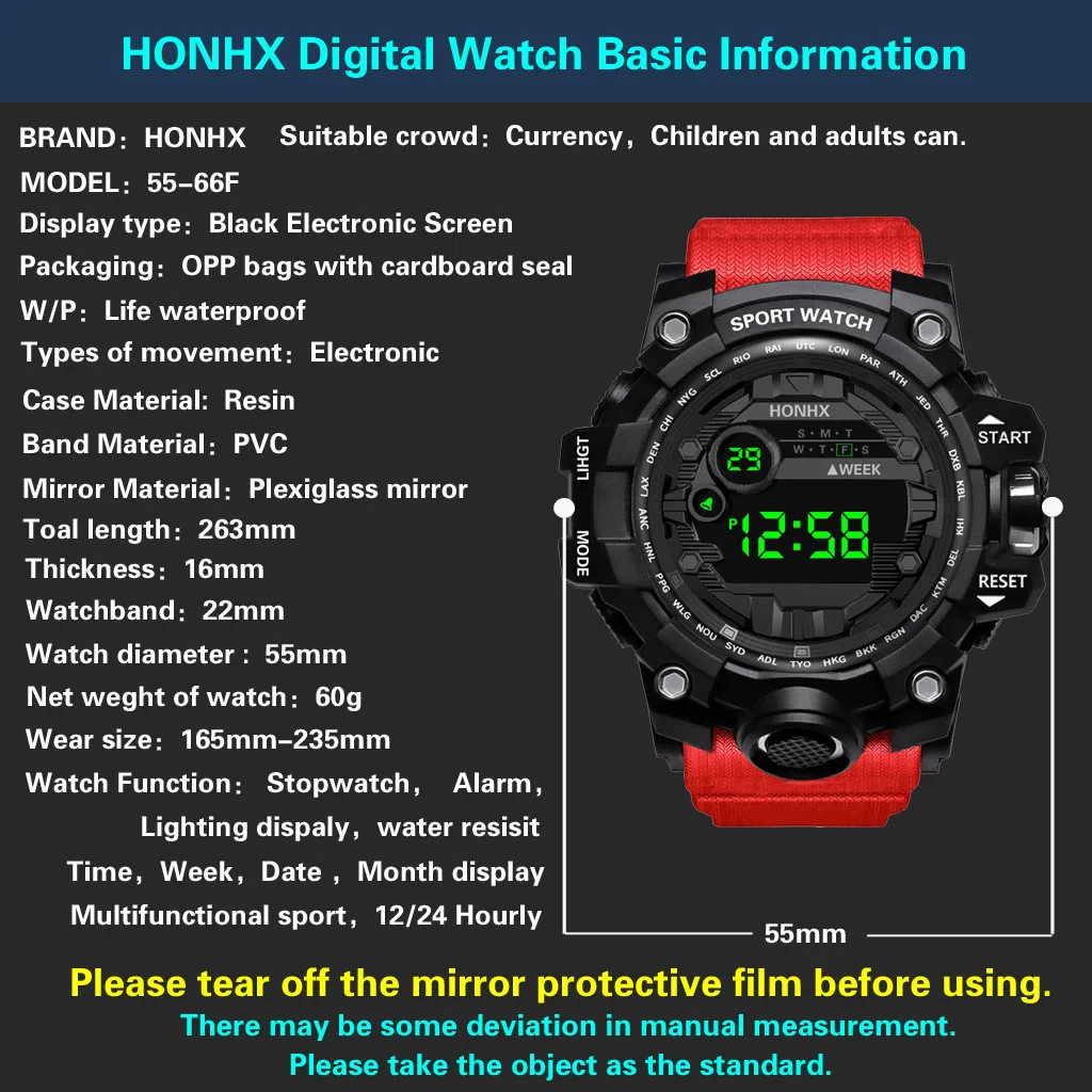 12. Водонепроницаемый: Эти электронные часы для обычных водонепроницаемых, можно мыть, брызгать и дождь. Но вы не можете принимать ванну, плавать или нырять, пожалуйста, носите его в соответствии с сценой.