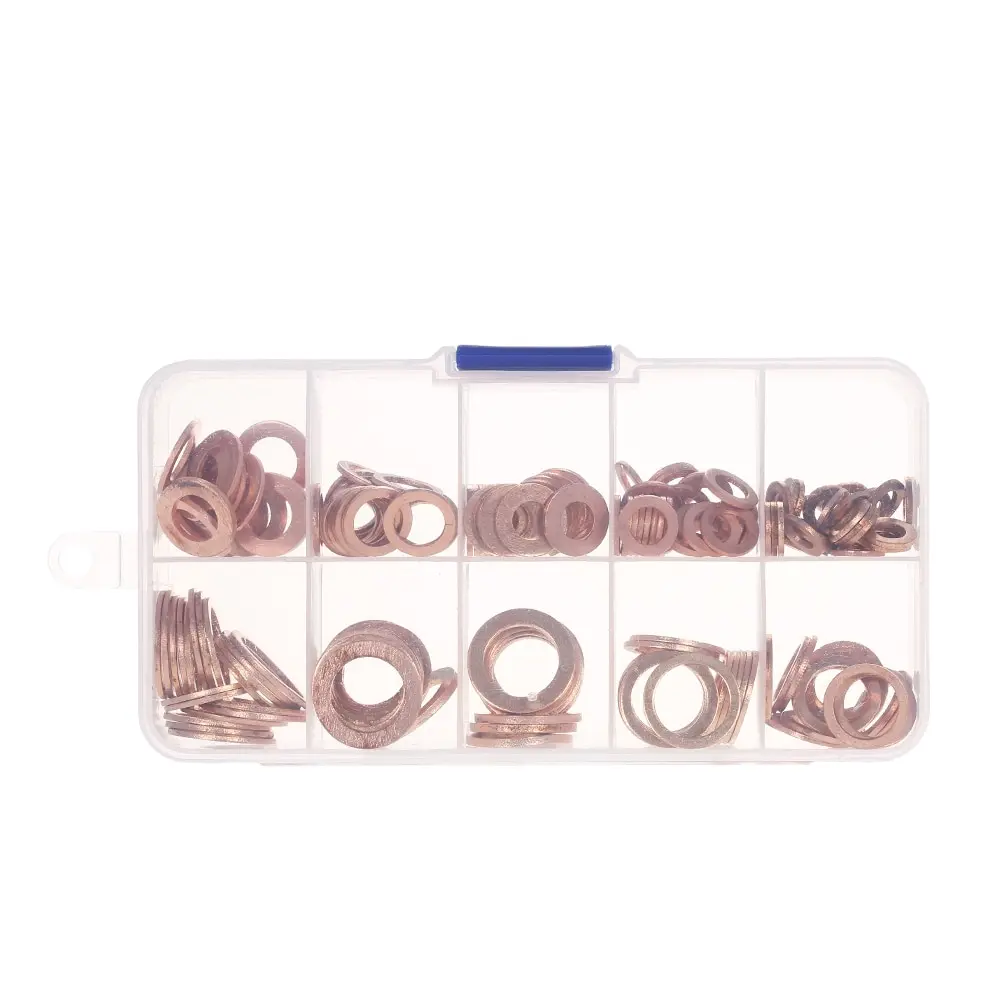 This copper washers kit of allen head socket hex screws with solid copper sump plug washer - all in a high quality plastic case. It contains the following sizes: M5*9*1 (30pcs), M6*10*1(30pcs), M6*12*1(20pcs), M8*12*1(20pcs), M8*14*1(20pcs), M10*14*(20pcs), M12*16*1 (20pcs), M12*18*1.5(20pcs), M14*18*1(20pcs).