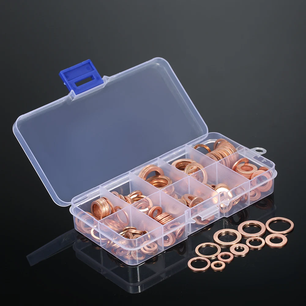 200PCS M5-M14 Copper Washers Gasket Set Flat Ring Seal Assortment Kit with Box 9 Sizes for Hardware Accessories+ Storage Box