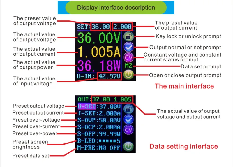 При подключении источника питания на экране сначала отображается окно приветствия, а затем входит в основной интерфейс. На основном интерфейсе на верхней части экрана находится установленное на выходе значение напряжения и установленное на выходе значение тока. Большое значение алфавита слева-это текущее реальное выходное напряжение, текущий реальный выходной ток и текущая реальная выходная мощность. Входное напряжение находится на нижней части экрана. Справа от экрана есть несколько значков рабочего состояния, значок блокировки клавиш, значок ненормального выходного состояния, значок постоянного напряжения и постоянного тока, значок набора данных и значок открытия или закрытия вывода.