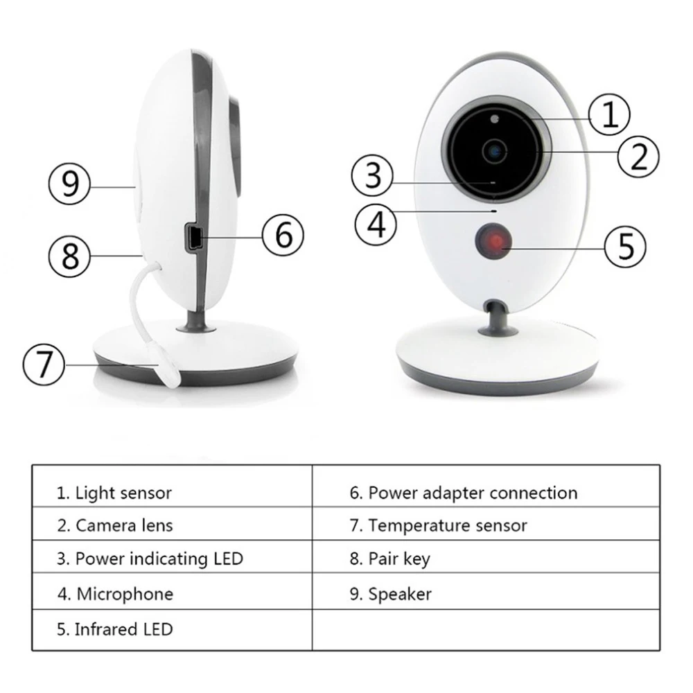 Особенности:Маленький размер-Портативный дизайн, удобно носить с собойТемпературный дисплей-С датчиком температуры, Контролируйте комнатную температуру ребенка в течение всего дня, помогая заботиться о здоровье вашего ребенка2-полосная обратная связь и свободный эффективный диапазон-Монитор обеспечивает дальность передачи до 160 футов/50 м внутри помещения, 850 футов/260 м снаружи. Вы можете играть в встроенные колыбельные или использовать функцию двусторонней обратной связи для комфорта ваших детей, когда захотитеАвтоматическое ночное видение-Позволяет ухаживать за вашими детьми в темноте, следя за ребенком всю ночь2,4-дюймовый высококонтрастный цветной ЖК-монитор-Этот видеоняня оснащен 2,4-дюймовым ЖК-экраном и подключен к детской камере с помощью усовершенствованной беспроводной технологии 2,4 ГГц, четко показывает нашим детям без помех WiFiДлительный срок службы батареи-До 24 часов в режиме VoxПоддержка нескольких языков-Английский/французский/испанский/португальский/итальянский/немецкий/Турецкий/русский Характеристики:Частота передачи: ISM 2400-2483,5 МГцМощность передачи: 17dBmСвободный эффективный диапазон: 160 футов/50 м в помещении, 850 футов/260 м на открытом воздухе, линия видимостиСпектр распространения: AFH и TDMA (частотно-прыгающий Спектр распространения и разделение времени Множественный доступ)Режим модуляции: GFSKРабочая температура: 14 - 122 градусов по Фаренгейту/ -10 - 45 градусов по ЦельсиюРабочая влажность: <85% Монитор:Размер ЖК-дисплея: 2,4 дюймаРазрешение: 320x240 пикселейЧувствительность приема: -90dBmТок потребления: 200 мААккумулятор: литий-полимерный аккумулятор 750 мАчИсточник питания: 5 В/1000 мА постоянного токаВес: 0,083 кг Камера:Датчик изображения: CMOSРазрешение: 0,3 мегапикселяМинимальное освещение: 0 люкс (IR on)Расстояние ночного видения: 15 футов (5 м)Потребляемая мощность: 200 мАИсточник питания: 5 В/1000 мА постоянного токаВес: 0,063 кг Использование методов:Шаг 1: подключите розетку для запуска детского блока, синий светодиодный светильник будет отображаться во время работыШаг 2: полностью зарядите родительский блок перед использованием, нажмите и удерживайте кнопку питания, по крайней мере, 3 секунды, чтобы включить егоШаг 3: поместите устройство для ребенка в удобное место и отрегулируйте камеру, пока вы не будете удовлетворены изображением в родительском устройствеИсточник питания: электрическийТип дисплея: цветХарактеристики: ЖК-дисплей, музыка, ночное видение, портативный, два приемникаТип узора: однотонныйАккумулятор: ДаРазмер ЖК-дисплея: 2,4 дюймаТребуемые Аккумуляторы: ДаТип оповещения: НетЧастота (ГГц): 2,4 ГГцТехнические характеристики: другиеУгол обзора: Диагональ 45 градусовПроизводительность ip-камеры: ночное видениеРазрешение: 320x240Вес посылки: 0,460 кгРазмер монитора (Ш x В x Г): 59x112x17 ммРазмер камеры (Ш x В x Г): 67x105x67 ммРазмер посылка (Д x Ш x В): 170x69x143 мм Детали упаковки:1 x детский монитор2 x адаптер питания1 руководство пользователя на английском языке Внимание>