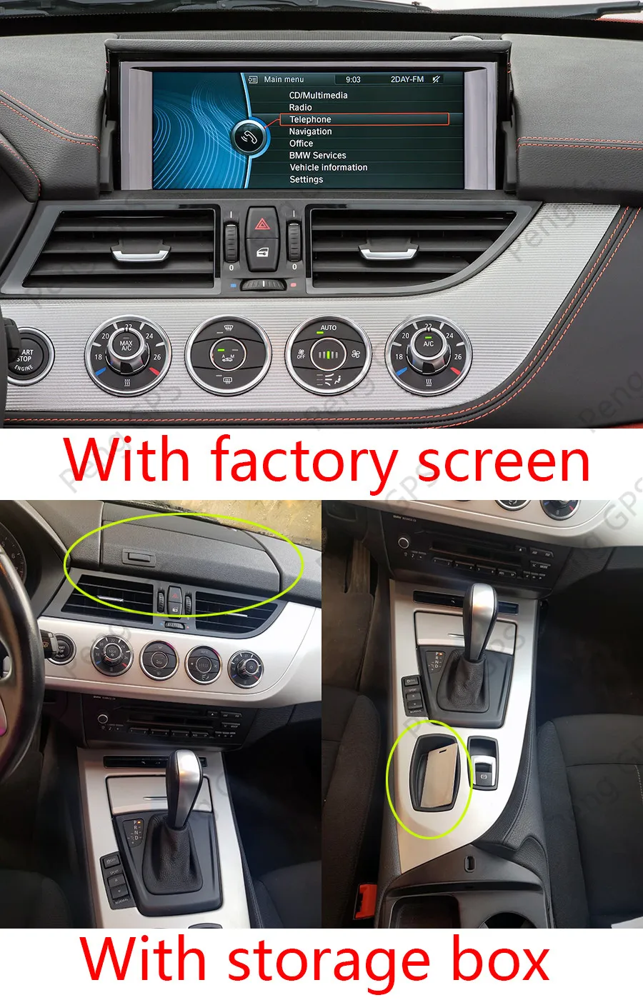Это установка plug-and-play, но мы рекомендуем вам найти местного профессионального инженера по установке или автомобильного магазина a & V для установки нашего оборудования в вашем автомобиле, чтобы вы могли избежать повреждения приборной панели и самого хоста. Конечно, если вам нужна какая-либо поддержка, вы можете связаться с нами. Для BMW Z4(E89) есть три различных панели приборов, с экраном, с ящиком для хранения и без ящика для хранения (или экрана). Наш продукт подходит только для BMW Z4(E89) с заводским экраном или коробкой для хранения. Если на приборной панели нет ни заводского экрана, ни хранилища, тогда нет возможности установить этот продукт. Чтобы установить этот продукт, ваш BMW Z4(E89) должен оснащаться AUX в порту, чтобы получить звук. Если на вашем автомобиле нет AUX порта, пожалуйста, не покупайте этот товар. Если вы не уверены, подходит ли он для вашего автомобиля, пожалуйста, оставьте информацию о своем автомобиле. Если приборная панель вашего автомобиля такая же, как на изображении ниже, вы можете приобрести эту модель