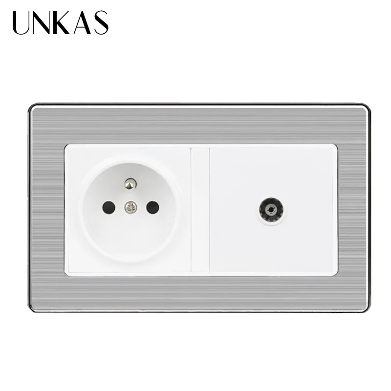 UNKAS заземленная 16А французская стандартная настенная розетка + розетка для телевизора из нержавеющей стали с матовой панелью