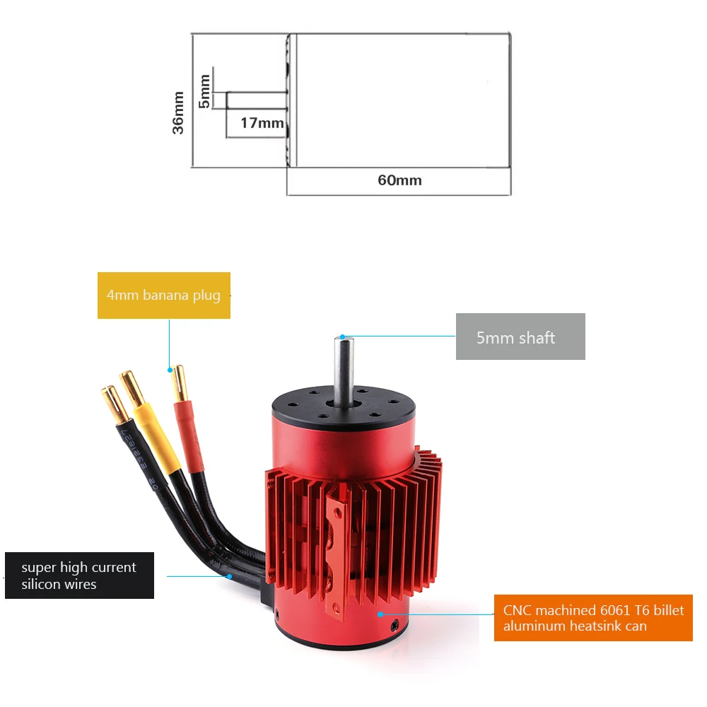 В комплект входит 3660 3800KV бесщеточный двигатель с сплавочным радиатором и 60A ESC. Он идеально подходит для 1/10 RC автомобилей гусеничного грузовика. Двигатель изготовлен из высококачественного алюминиевого сплава, который производится из новейших фрезерных станков с ЧПУ. Таким образом, он может обеспечить более длительное время работы с высокой эффективностью, высокой мощностью и скоростью вращения. И ESC построен с компонентами высочайшего качества для обеспечения высокой эффективности работы. Он имеет улучшенную реакцию дроссельной заслонки, отличное ускорение, сильные перерывы и линейность дроссельной заслонки.