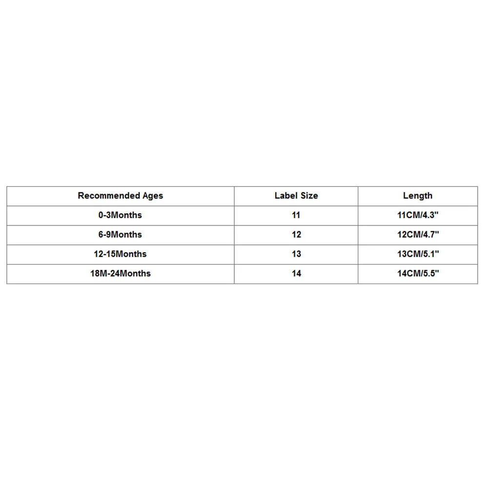 Рекомендуемый возраст Этикетка Размеры Длина От 0 до 3 месяцев 11 11 см/4,3" От 6 до 9 месяцев 12 12 см/4,7" 12-15Months 13 13 см/5,1" 18M-24Months 14 14 см/5,5"