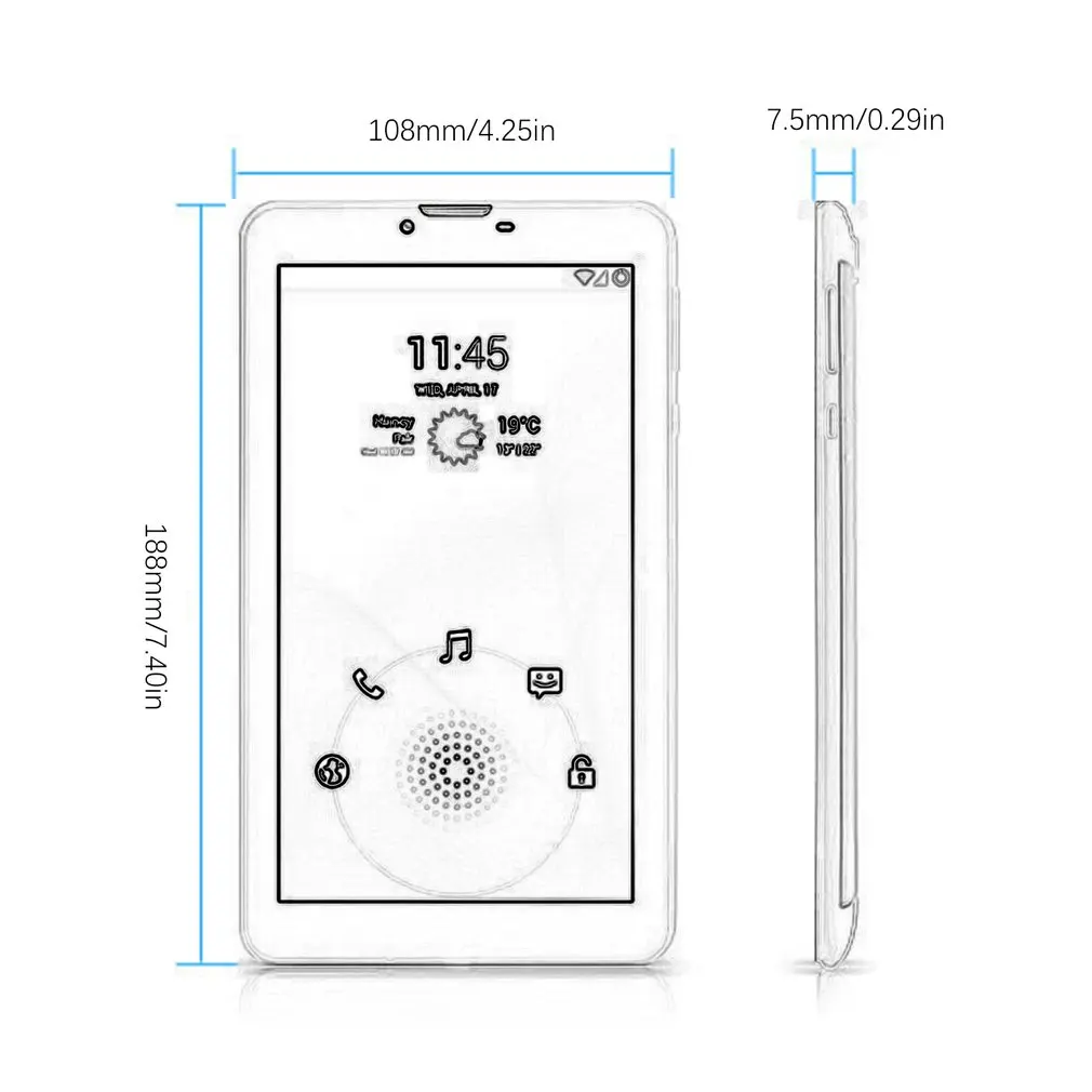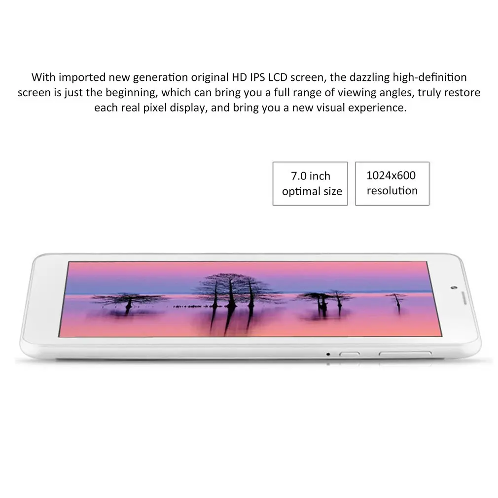 Описание продукта:ПроцессорMTK6572 двухъядерный Cortex A7 1 ГГц Полоса пропускания сети2G GSM 850/900/1800/1900 МГц3g WCDMA 850/2100 МГцОперативная память512 MBВстроенная память8 ГбБатарея2800 ма-чКлючМощность, Vol +, Vol-OSAndriod 4,2Экран7 дюймов HD1024x600p емкостный сенсорный экран2 КамераСпередиСзадиG-СенсорДаПросмотр фотографийBMP, JPG, GIF, PNGФормат видеоMEPG 1/2/4, H.263/H.264 и т. дПоддерживаемые форматы аудиоMP3, WMA, WAV, OGG, FLAC, ALAC, APE, AACGps Да WI-FIДаFM радиоДаBluetooth Да МикрофонДаДинамикДаСим-картыДа Поддержка двух sim-карт GSM 2G + WCDMA 3gНаушники3,5 мм разъем для наушниковПортыMicro-USB-1 шт.1 слот для карт TF2 x слот для sim-карты1 x разъем для наушниковЧто в коробке