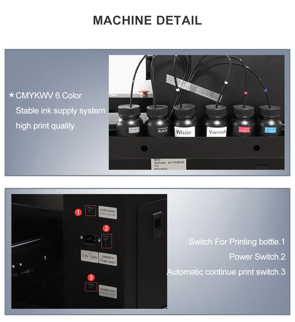 1) он использует УФ-чернила(CMYK) +W + V, Напечатайте белый + цвет одновременно, затем напечатайте лак во второй раз.2)Держатель для бутылки бесплатно, Можно напечатать как на плоской поверхности, так и на поверхности цилиндра. Максимальная высота для бутылки 150 мм.3) для epson оригинальная R1390 печатающая головка используется.4) система водяного и воздушного охлажденияПараметры: