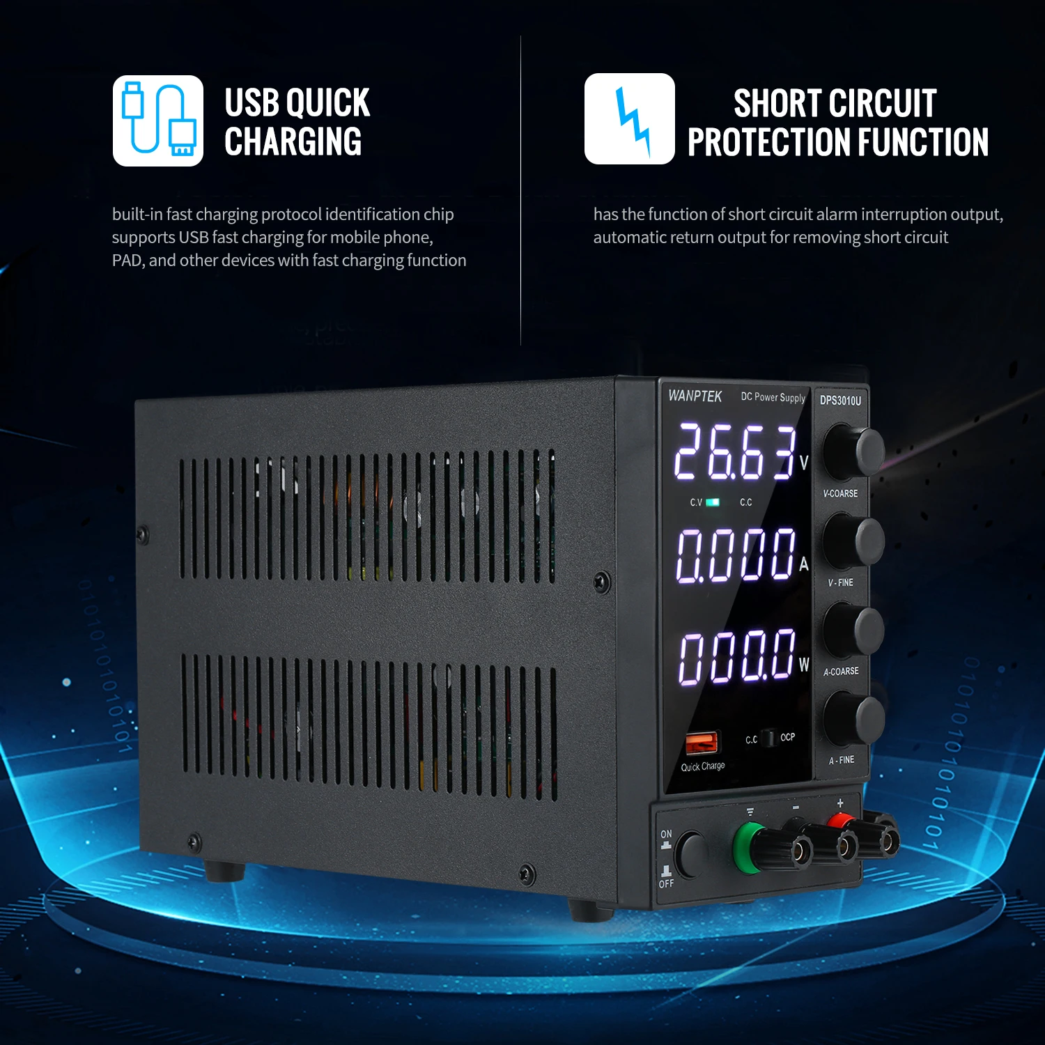 DPS серии изделия представляют собой три-окна четырехбитный DC регулируется питания, который может отображать напряжение, ток, и в то же время. Устойчивость электропитания и коэффициент пульсации очень хорошие, имеет две модернизированные функции быстрой зарядки USB и идеальную защиту от короткого замыкания. Может быть широко использован в мобильный телефон/техническое обслуживание компьютера, использование школы и производства, и т. Д.