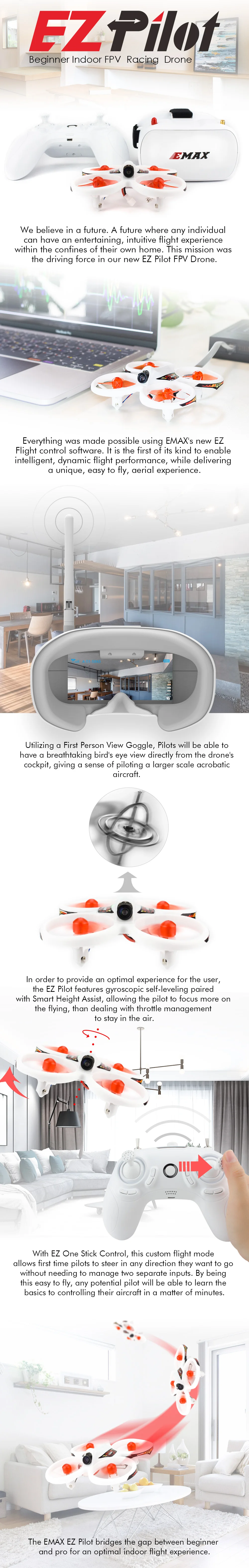 Используя очки с видом от первого лица, пилоты смогут иметь захватывающий вид с птичьего глаза прямо из кабины дрона, давая ощущение пилотирования более крупного акробатического самолета. Для того, чтобы обеспечить оптимальный опыт для пользователя, EZ Pilot имеет Гироскопический самонивелирующийся в сочетании с Умной помощи по высоте, позволяя пилоту больше фокусироваться на полете, чем дело с управлением дроссельной заслонки, чтобы оставаться в воздухе.
