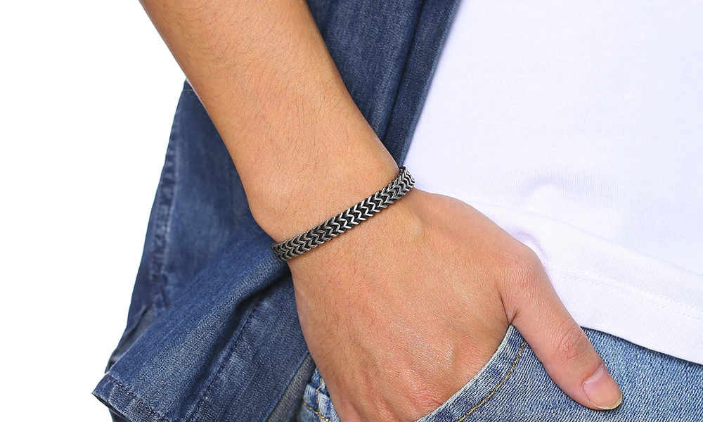 Этот мужской браслет легко сочетается и подходит для любого стиля одежды. Звенья из нержавеющей стали, скрученные в уникальный дизайн «Лисохвост».