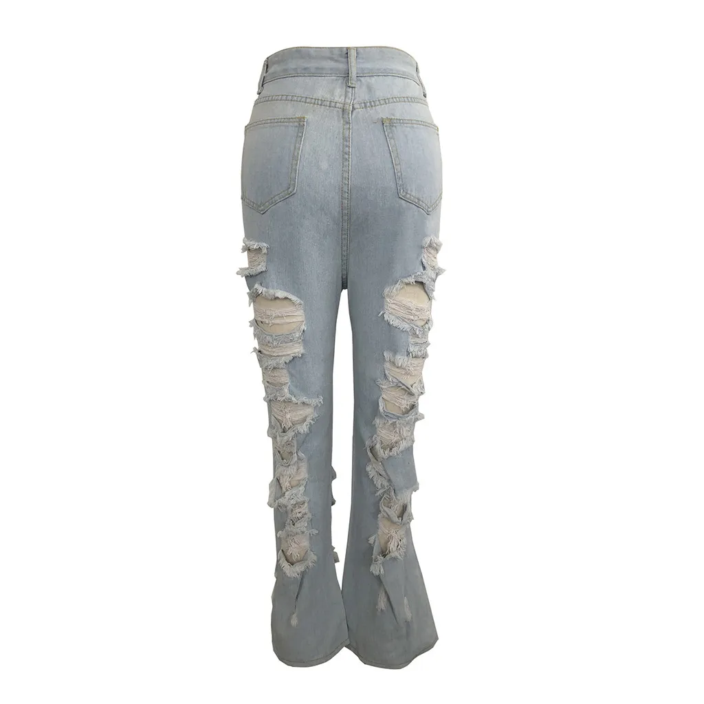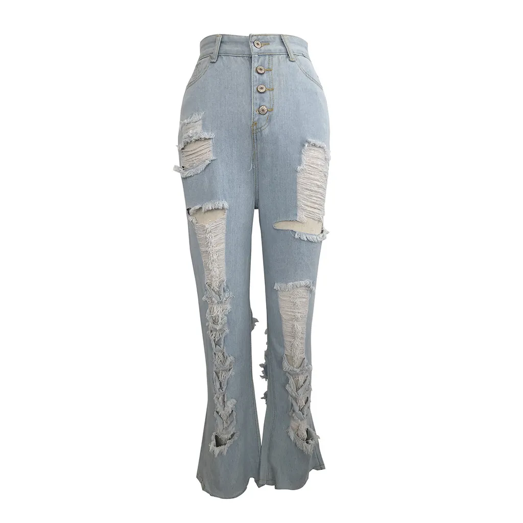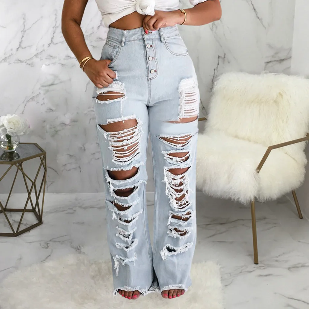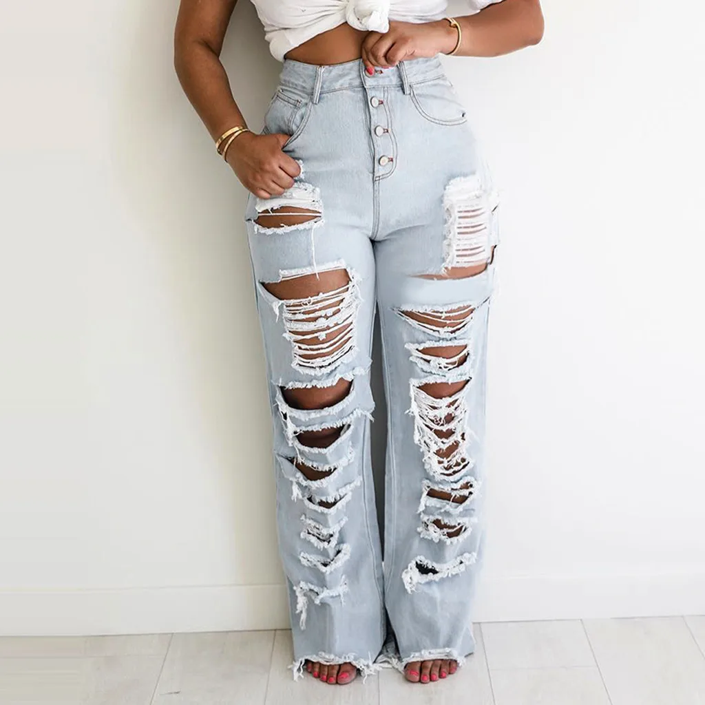 Модные женские выбеленные джинсы с карманами и прямыми дырками, повседневные джинсовые брюки с высокой талией