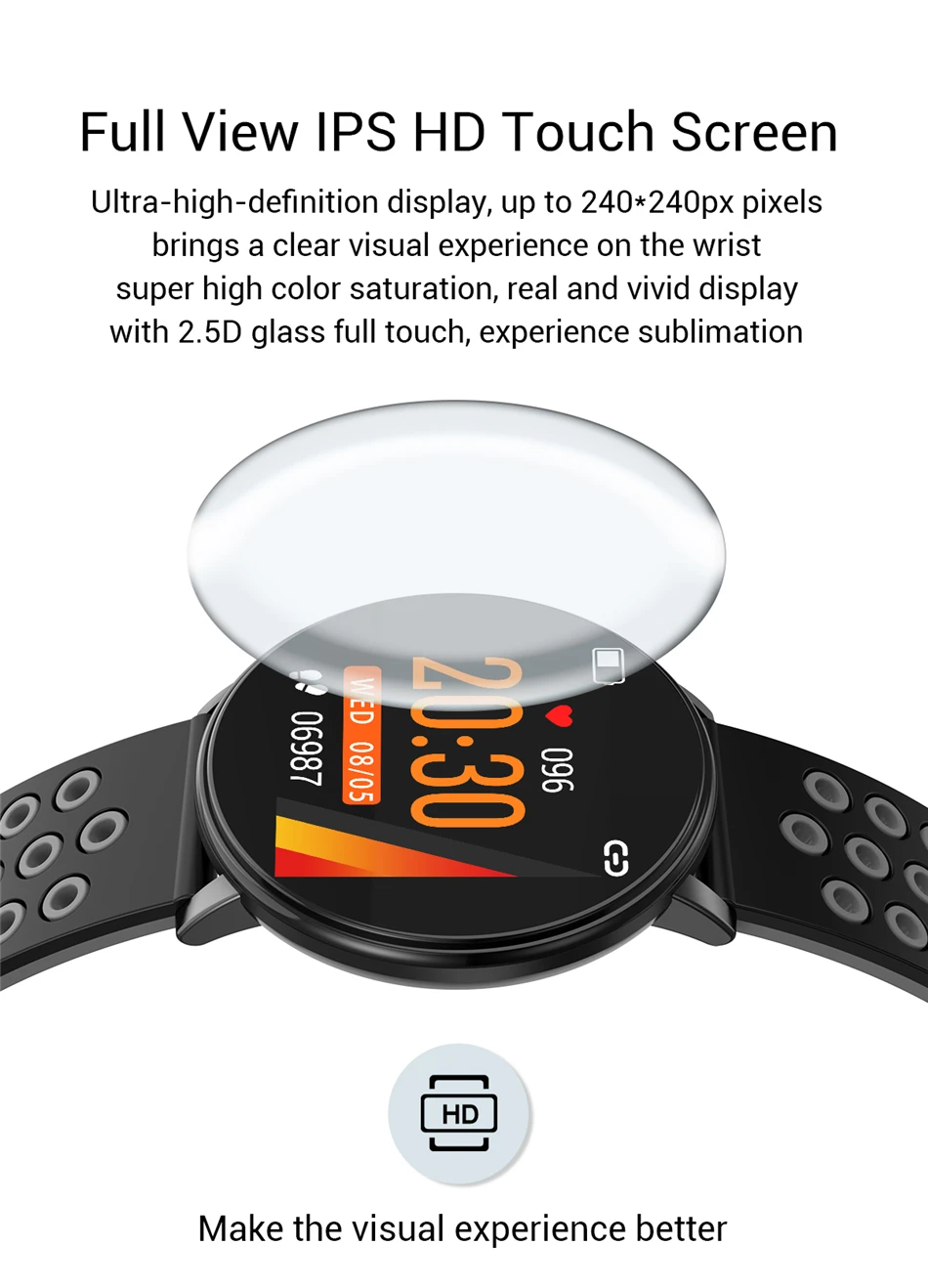 Модель: W8 Bluetooth BT 4,0 или выше Совместимая Операционная система Android 4,4 или выше, iOS 8,0 или выше Управление режим сенсорная клавиша Название приложения Языки применения: английский, португальский, испанский, французский, немецкий, итальянский, русский, японский, корейский, арабский, упрощенный китайский, традиционный китайский Специальная функция Водонепроницаемый IP67 Монитор сердечного ритма поддержка Приборы для измерения кровяного давления поддержки SpO2 монитор Поддержка Монитор сна поддержка Поддержка мультиспортивного режима Шагомер поддержка Поддержка напоминания о звонках или сообщениях Снижение поддержки звонков Уведомления поддерживают Facebook, WeChat, WhatsApp и т. Д. Тип сигнального устройства вибрации Автоматический светильник экран Поддержка карты памяти Секундомер поддержка Другие функции поддерживают будильник, календарь, напоминание о сидячем положении, дистанционное управление камерой, защита от потери, Технические параметры Датчик G, датчик сердечного ритма Экран Размер: 1,3 дюйм (ов) Тип: IPS Разрешение: 240*240 пикселей Емкость аккумулятора: 180 мАч Время зарядки: около 2 часов Тип зарядки: Магнитная Зарядка/Базовая зарядка/зажим для зарядки Внешний вид и детали Ремень Материал: силикон Цвет: синий, черный, розовый, красный, зеленый, белый