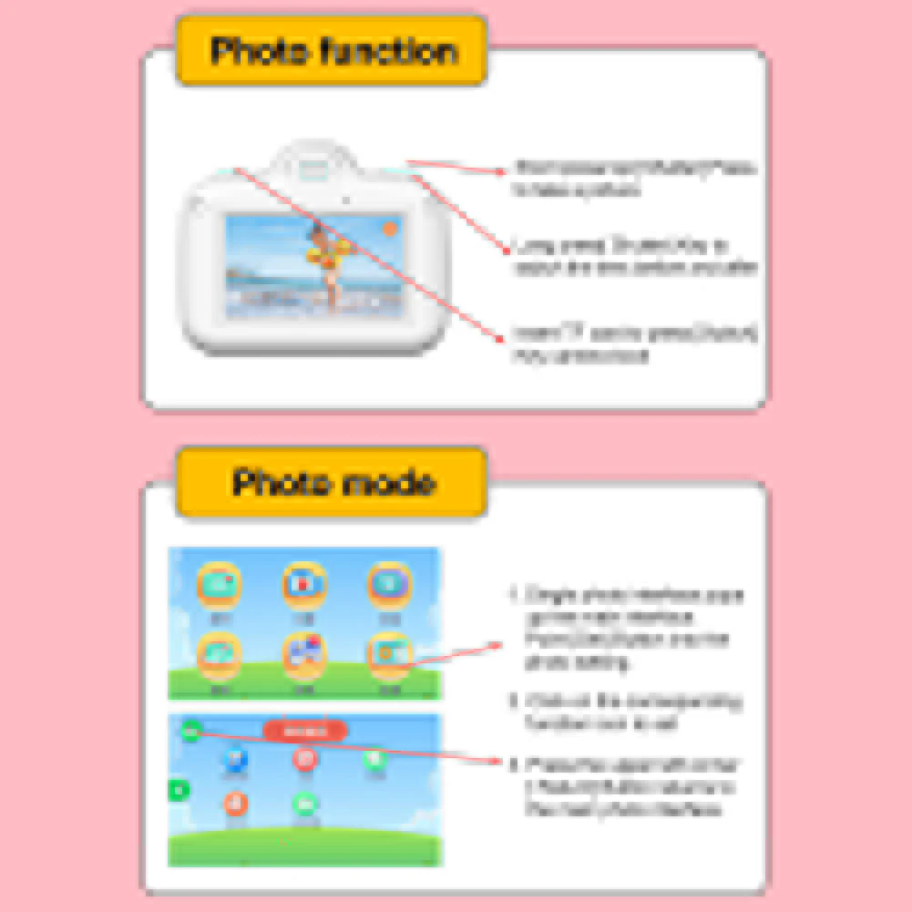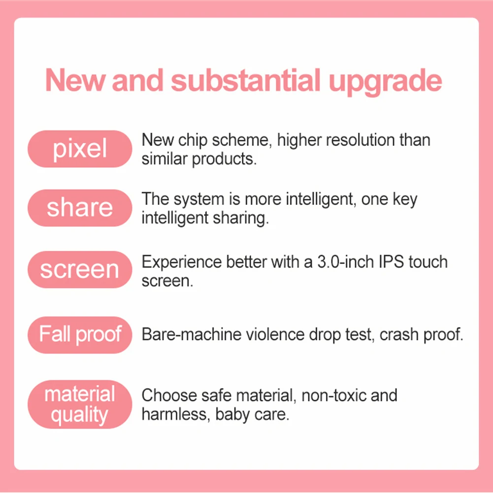 1. Материал изделия: Изготовлен из безопасного АБС-пластика, детская камера нетоксична, безвредна, безопасна для здоровья и безопасности. С противоударной безопасной конструкцией камера подходит для детской кожи, поэтому обеспечивает вашим детям удобный и безопасный способ съемки и записи видео.Чистящая ткань* 1