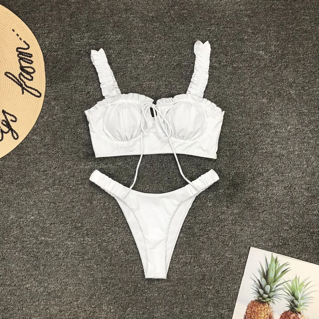 Женский купальный костюм на бретельках, Одноцветный удлиненный пляжный комплект с бюстгальтером без косточек, 2019