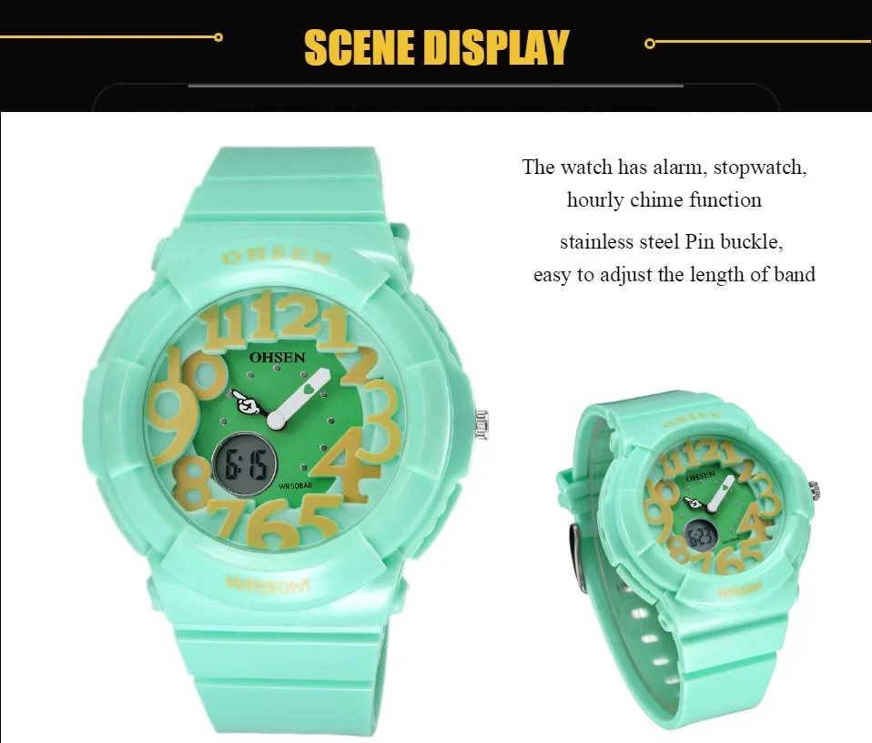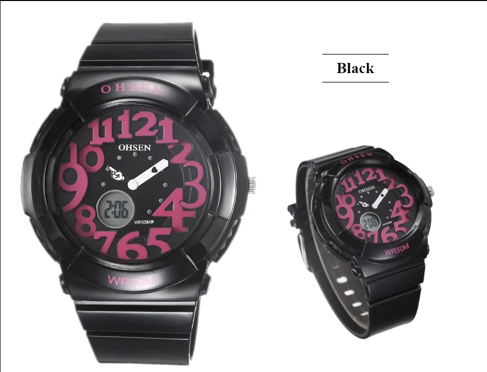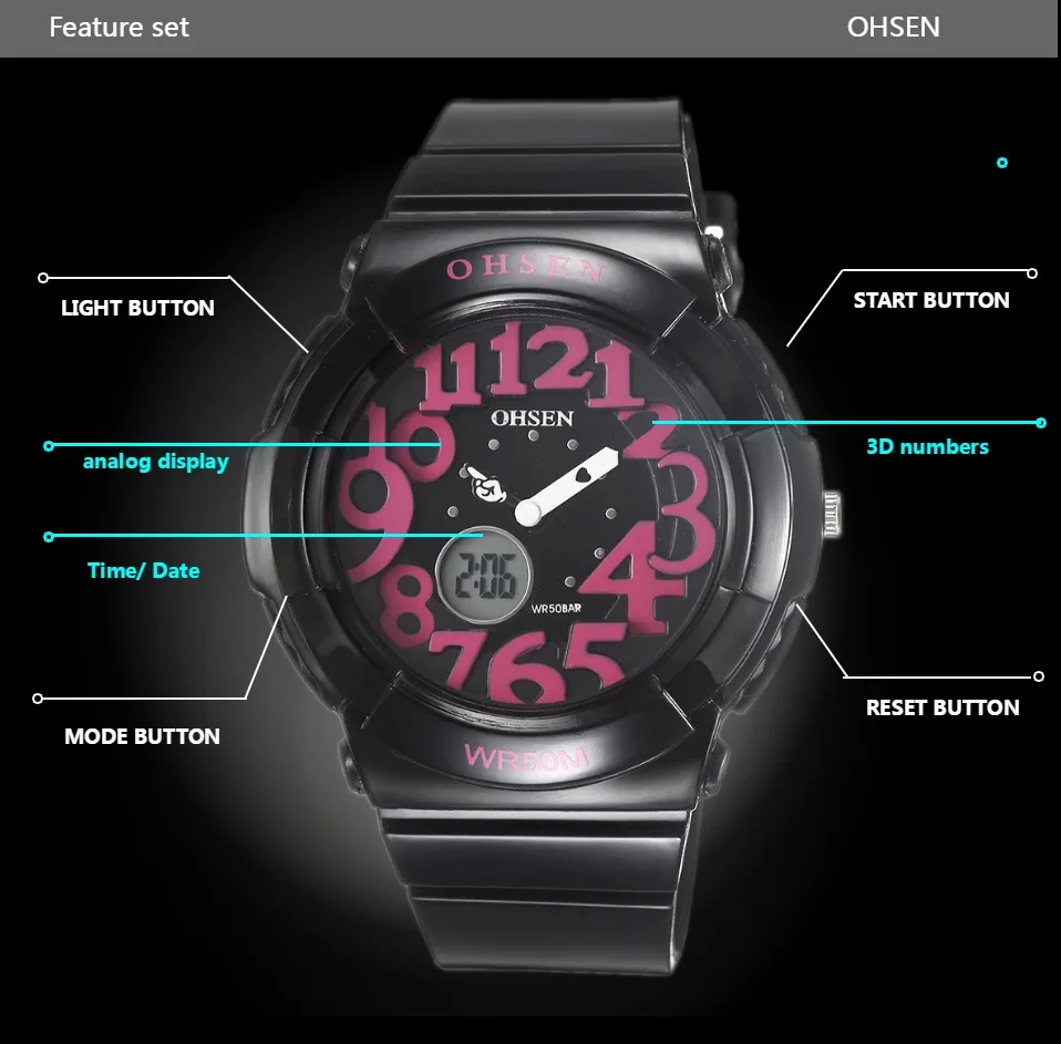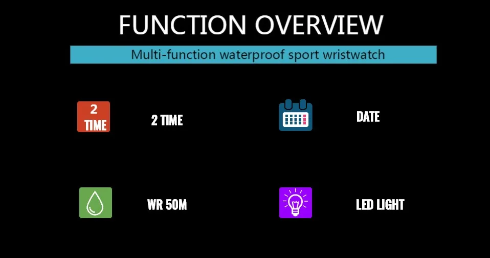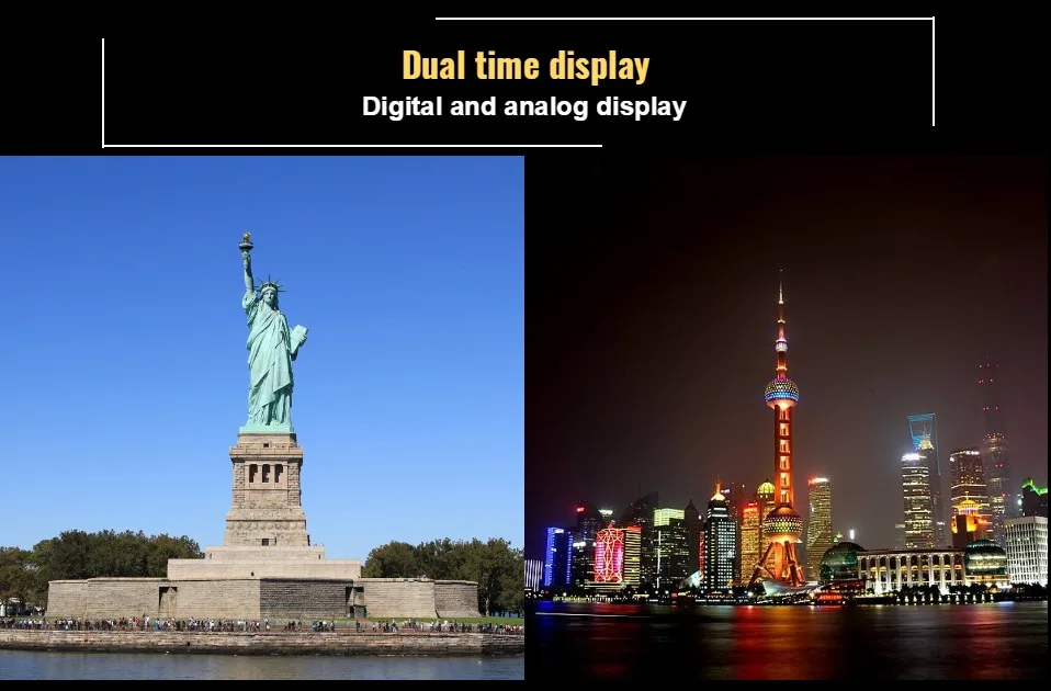 С двумя часовыми поясами Цифровой: час, минута, секунда, дата Дополнительный ЖК-светильник для отображения времени в темноте Водонепроницаемость до 50 м (не нажимайте кнопку в воде) Точность: ± 15 секунд в месяц