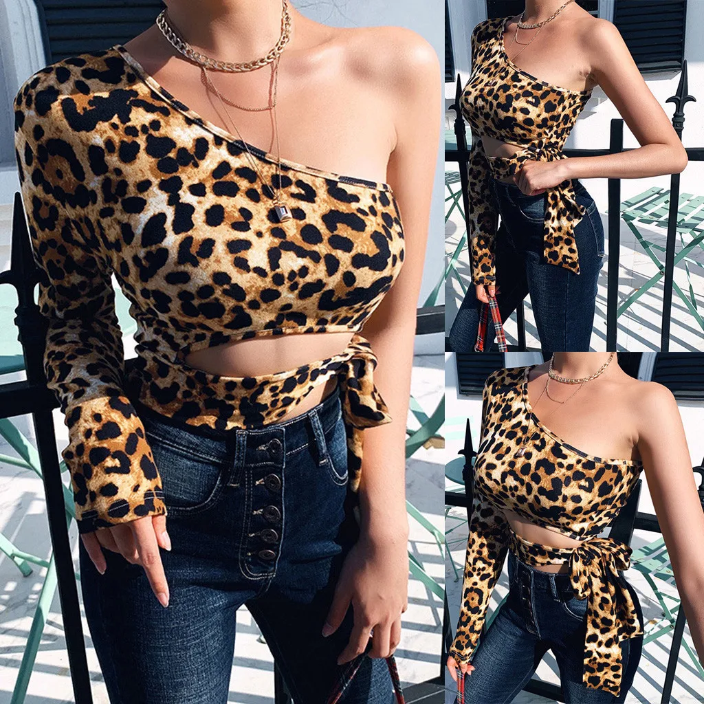 Женская модная леопардовая бандажная тонкая короткая блузка с длинным рукавом