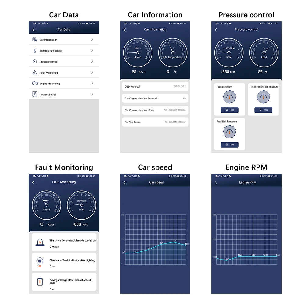 Считывание диагностического кода ошибки очистите код ошибки (очистите код ошибки и выключите MIL) обороты двигателя в минуту (об/мин) Расчетное значение нагрузки температура охлаждающей жидкости скорость состояния топливной системы кратковременная топливная ситуация долгосрочная топливная ситуация впускной коллектор давление впрыска топлива заранее время впускного воздуха Температура потока воздуха дроссельная заслонка Абсолютное Положение Обнаружение кислорода напряжение, связанное с кратковременное состояние топливной системы контроль расхода топлива, И т. д.