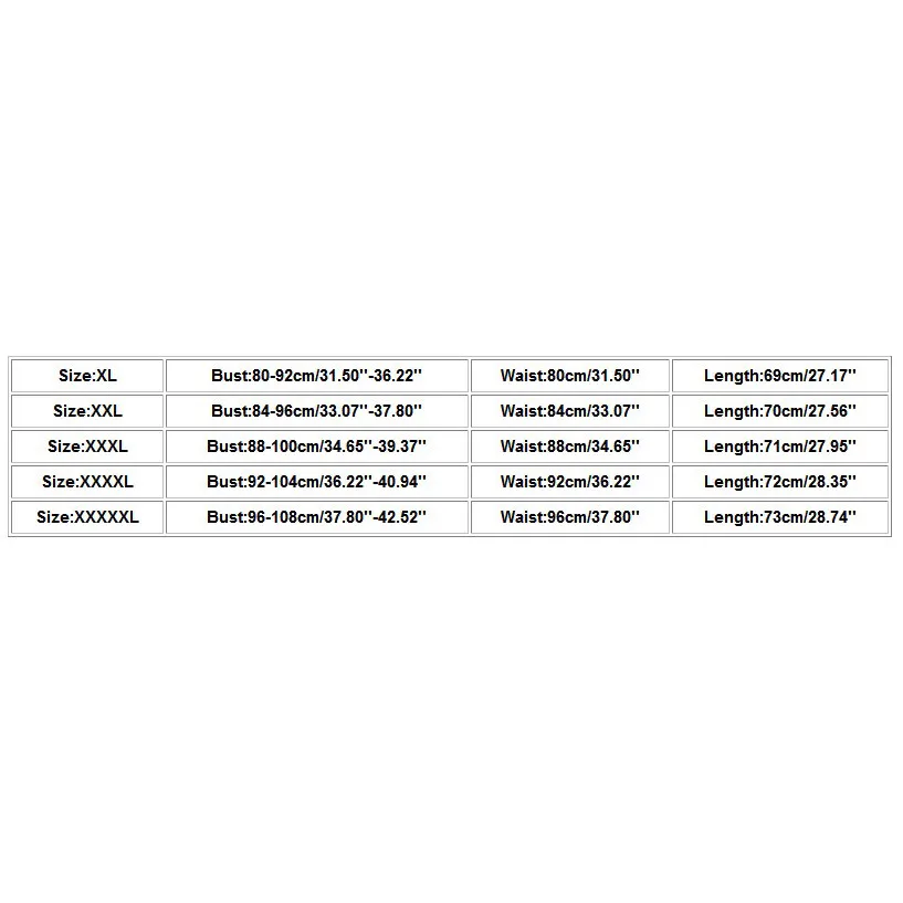 Размеры Обхват груди Обхват талии Длина XL 80-92 см/31,50 ''-36,22'' 80 см/31,50'' 69 см/27,17'' XXL 84-96 см/33,07 ''-37,80'' 84 см/33,07'' 70 см/27,56'' XХХL 88-100 см/34,65 ''-39,37'' 88 см/34,65'' 71 см/27,95'' XXXXL 92-104 см/36,22 ''-40,94'' 92 см/36,22'' 72 см/28,35'' XXXXXL 96-108 см/37,80 ''-42,52'' 96 см/37,80'' 73 см/28,74''