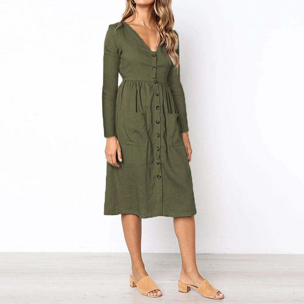 - autumn/winter fashion v-neck button pocket long-sleeved dress