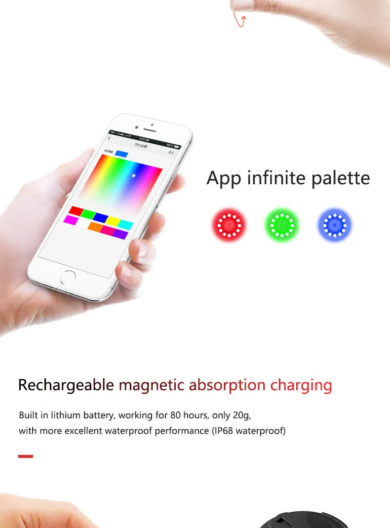 Модель: SR-BTL20 Тип подключения: BLE4.0 Аккумулятор: перезаряжаемый литий-ионный аккумулятор Подзарядка: Магнитная Зарядка Время перезарядки: 2 часа Время работы: 24-80 часов Яркость: 60lm Водонепроницаемый: IP68 Размеры: 41X41X19mm Вес: 20g Поддержка приложения: Shanren Sport Устройства IOS и Android: iOS 7,0 или более поздние версии, Android 4,3 или более поздние версии.