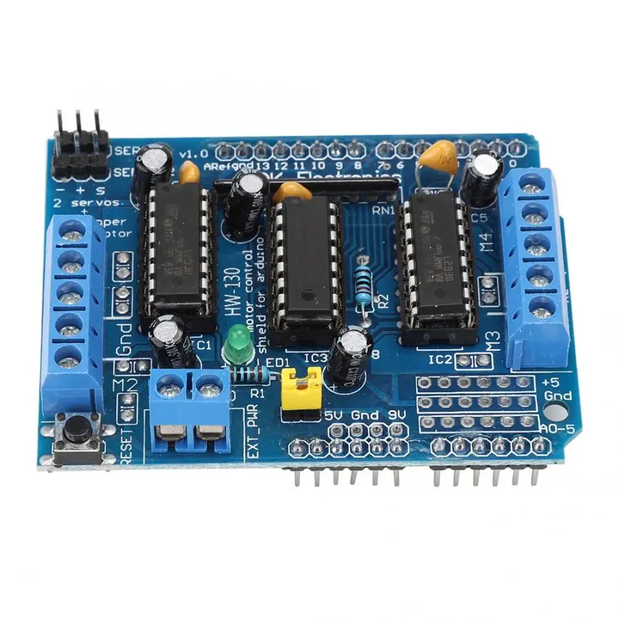 Он может управлять 4 канала двигатели постоянного тока или 2 канала шаговые двигатели во время вождения 2 сервоприводы, новинка. Больше функций, простота в эксплуатации, с мощной поддержкой библиотеки драйверов и обновлениями функций. С кнопкой сброса для Arduino, до 4 двунаправленных двигателей постоянного тока и 4 каналов ШИМ регулировка скорости (приблизительно 0.5% разрешения). До 2 шаговых двигателей с положительным и отрицательным контролем, одним/двойным шаговым управлением, переплетенным или микроступенчатым и поворотным углом управления. 4-полосная h-моста с L293D чип, каждый канал мост обеспечивает 0.6A (Пиковый 1.2A) ток с тепловая защита от обратного подключения, защита от короткого замыкания 4,5 V 36V. Выдвижные резисторы обеспечивают остановку двигателя при включении и совместимость с Mega, Diecimila, Duemilanove. Полный набор запасных частей доступен для любителей DIY, которые хотят сделать это сами.