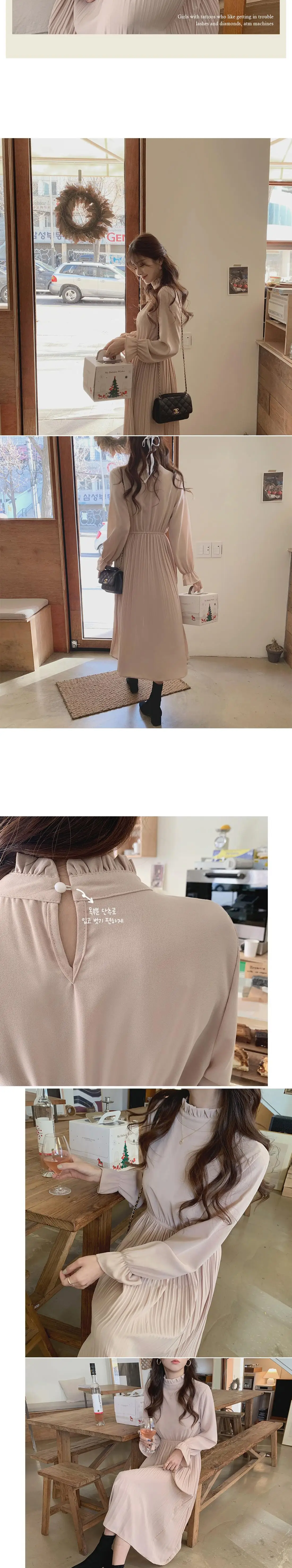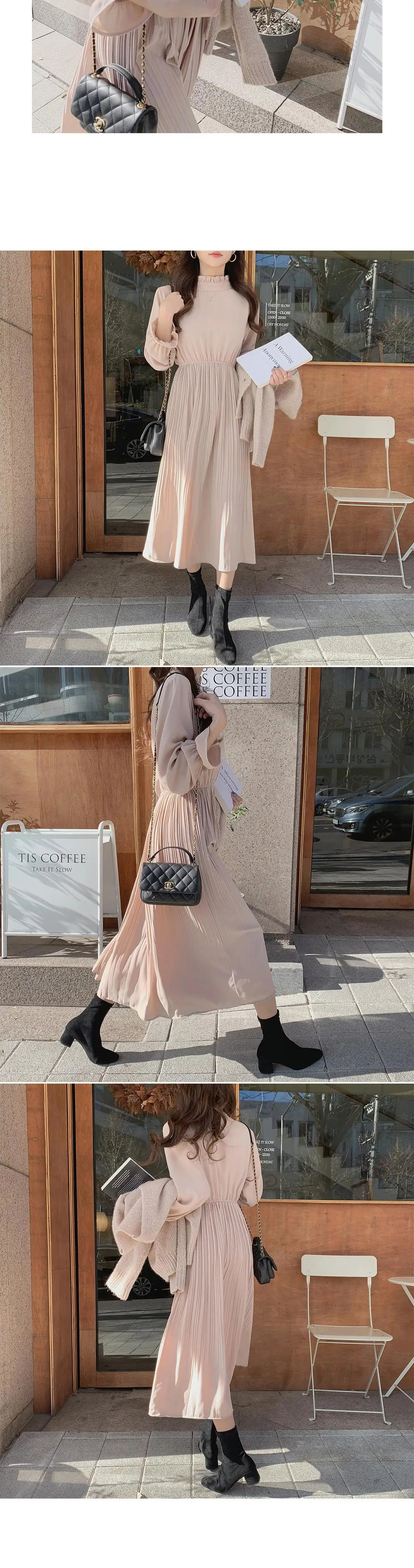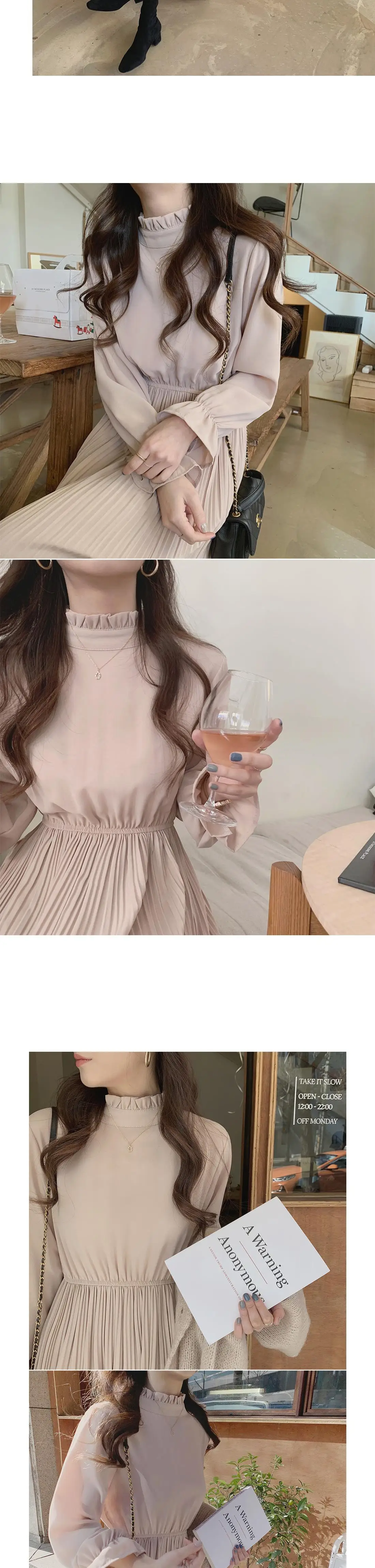 Весна 2020, красивые платья, длинное корейское женское платье с расклешенным рукавом, приталенное ТРАПЕЦИЕВИДНОЕ плиссированное платье с высоким воротником, винтажное 12916
