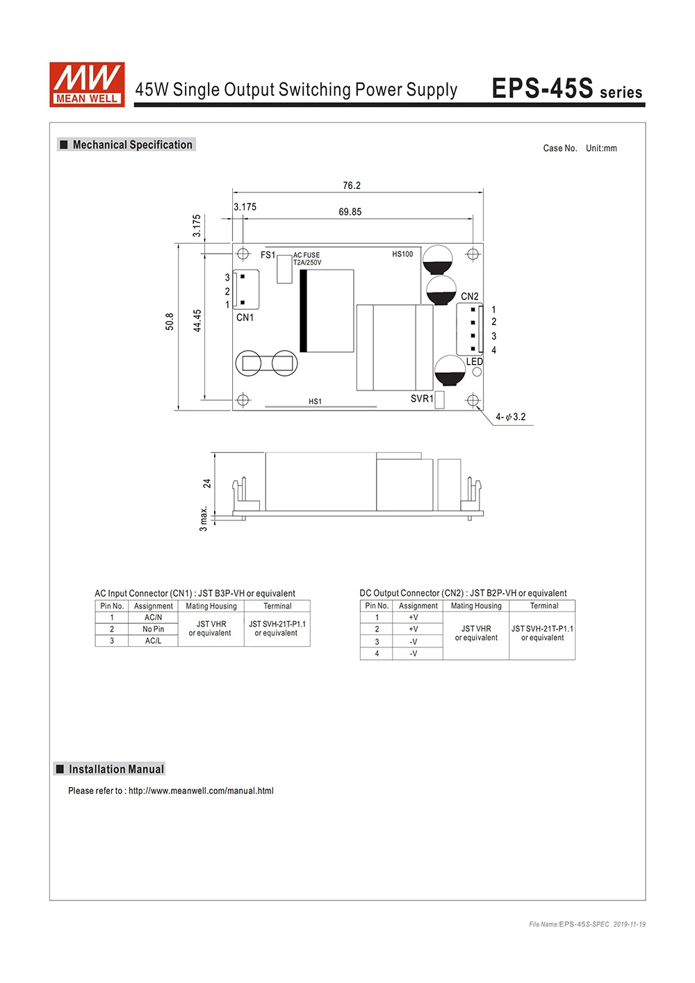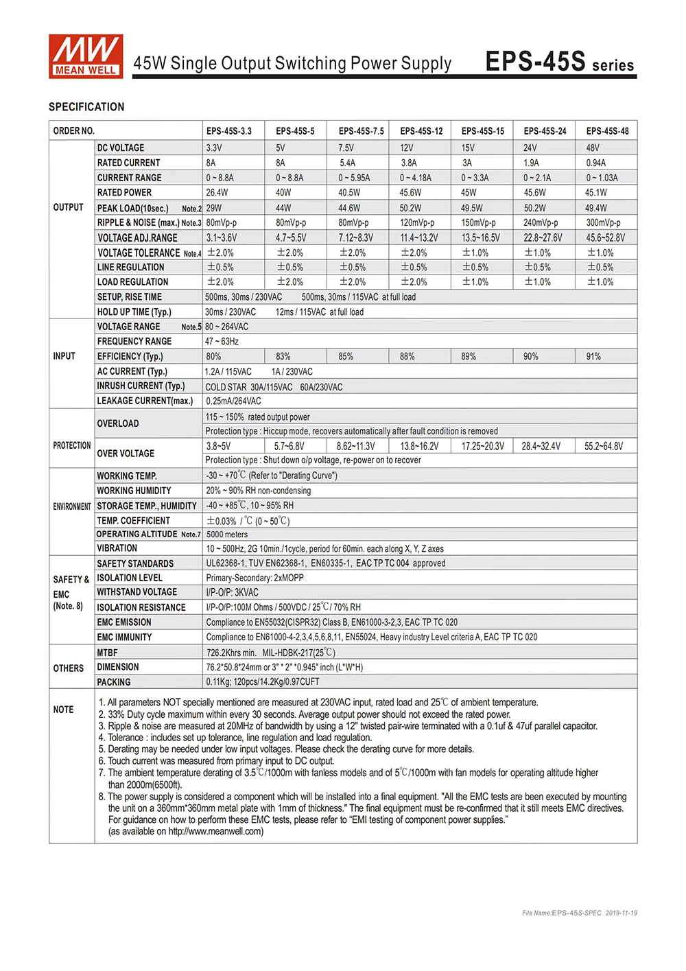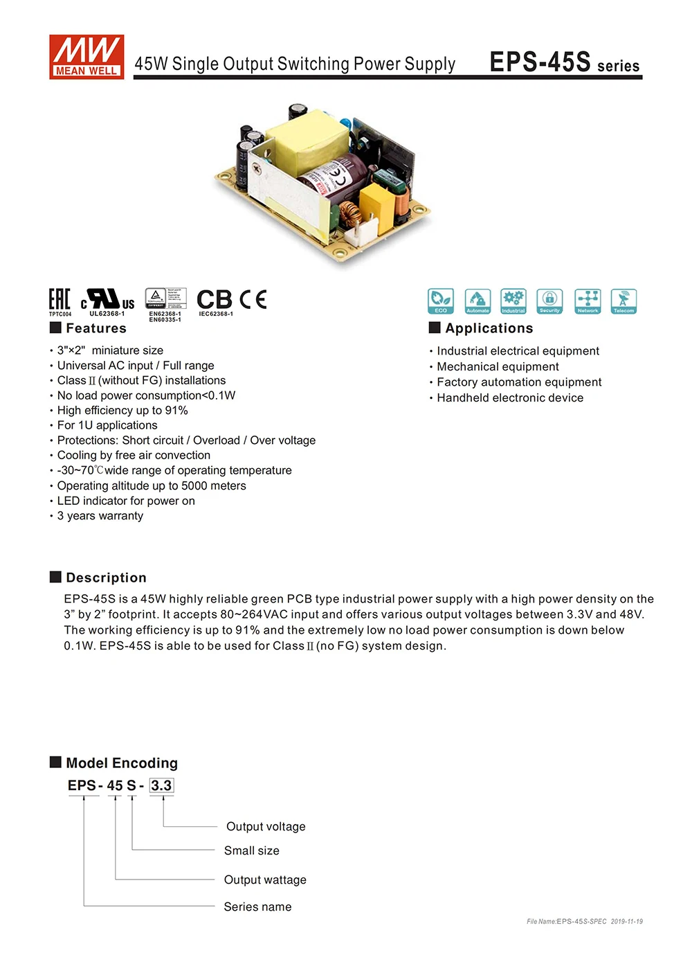 EPS-45S-это высоконадежный Промышленный источник питания зеленого типа PCB мощностью 45 Вт с высокой плотностью мощности на 3 ”на 2”. Он принимает 80 ~ 264VAC вход и предлагает различные выходного напряжения между 3,3 и 48V. Эффективность работы до 91% и очень низкий нагрузки потребеление энергии находится внизу 0,1 W. EPS-45S может использоваться для проектирования системы класса (без FG).