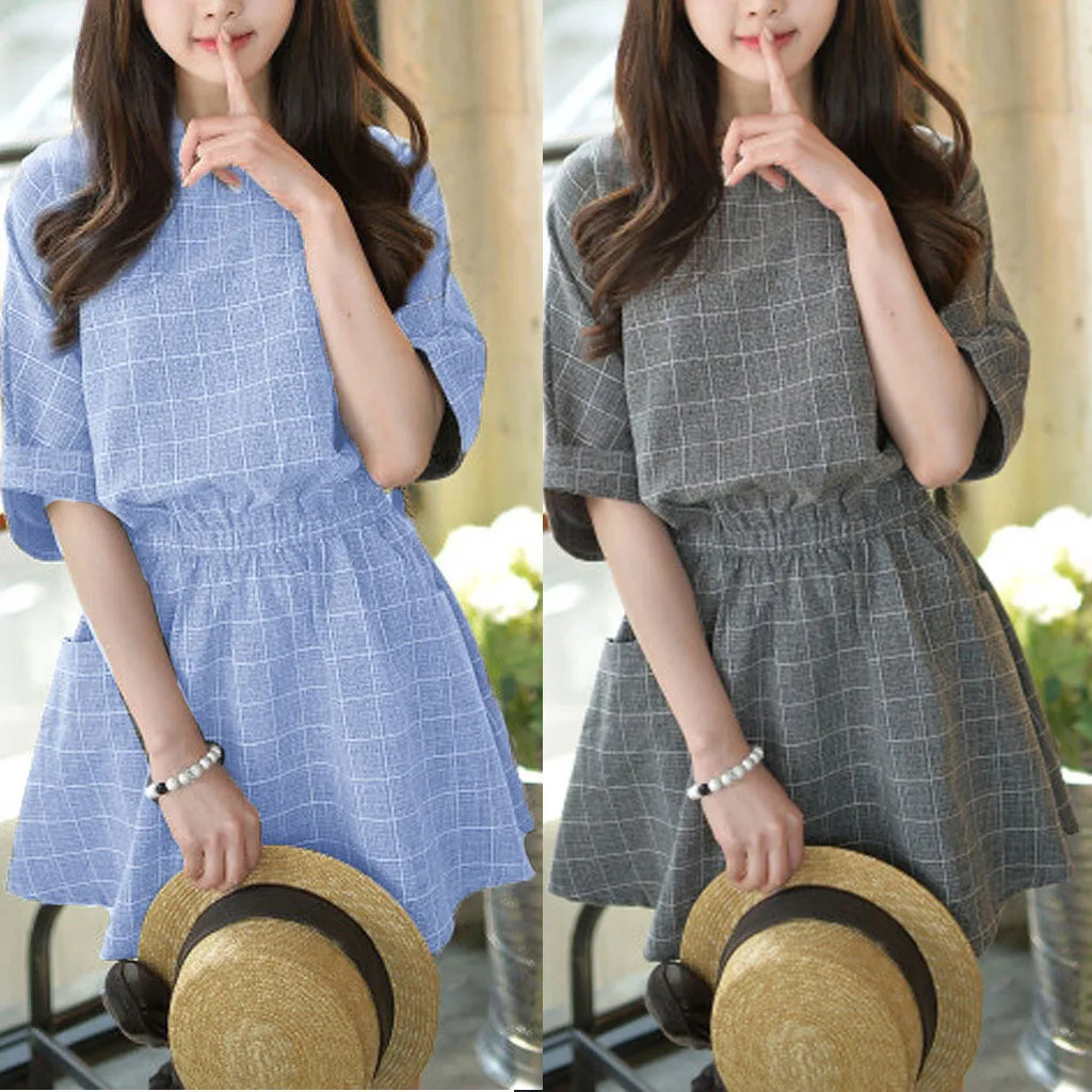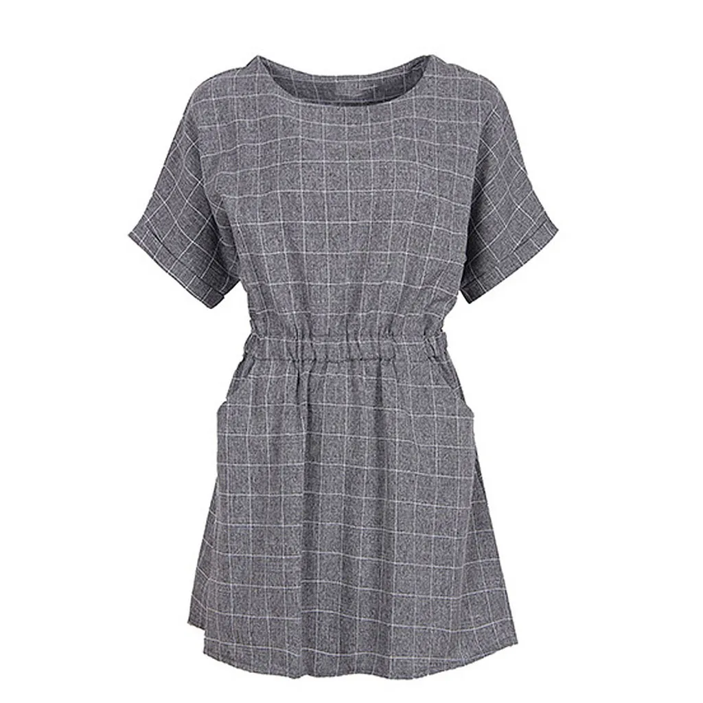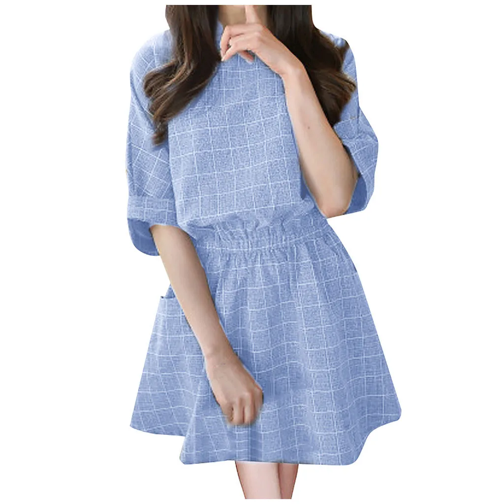 Мода женщин сплошной цвет o-образным вырезом плед платье свободное в талии Половина рукава платье