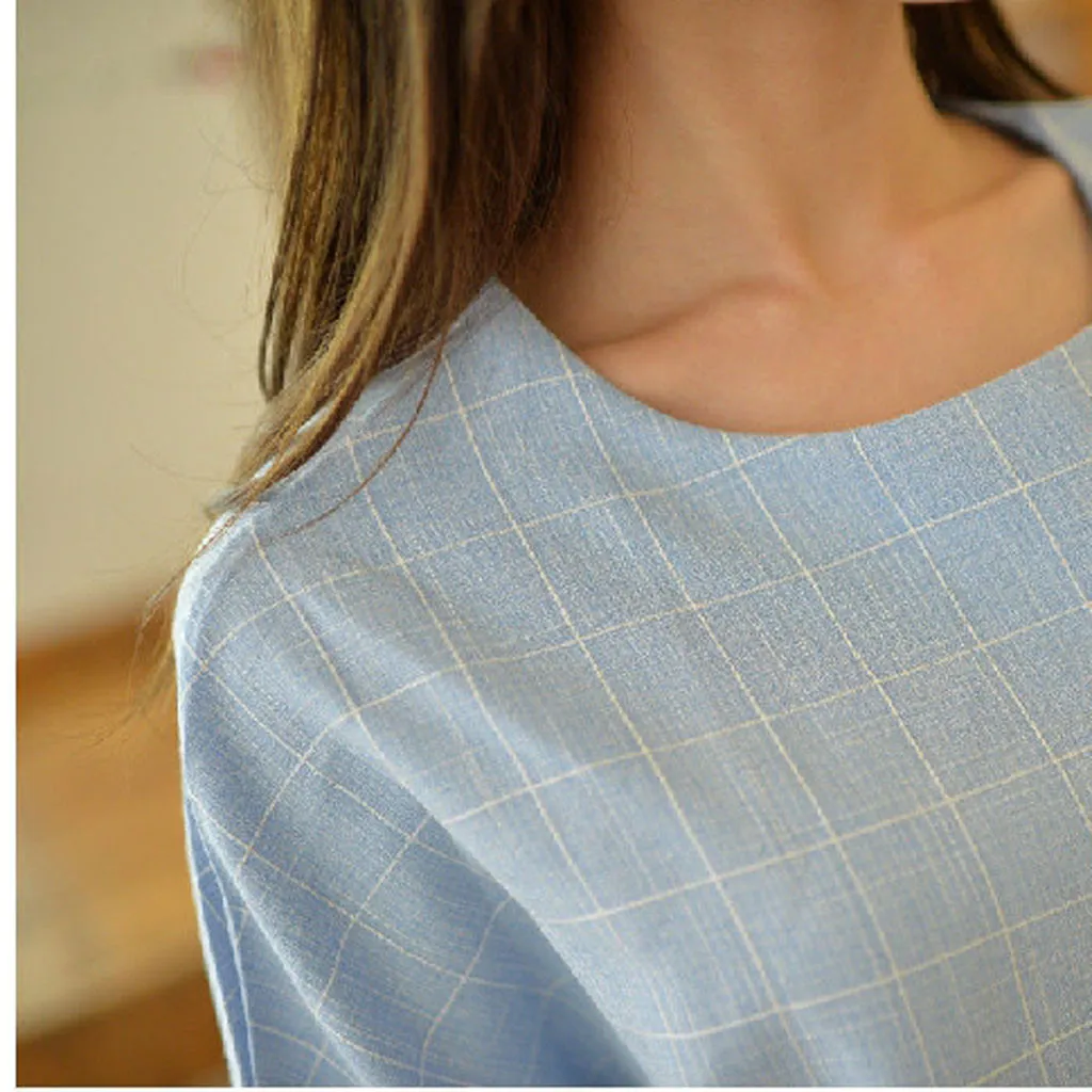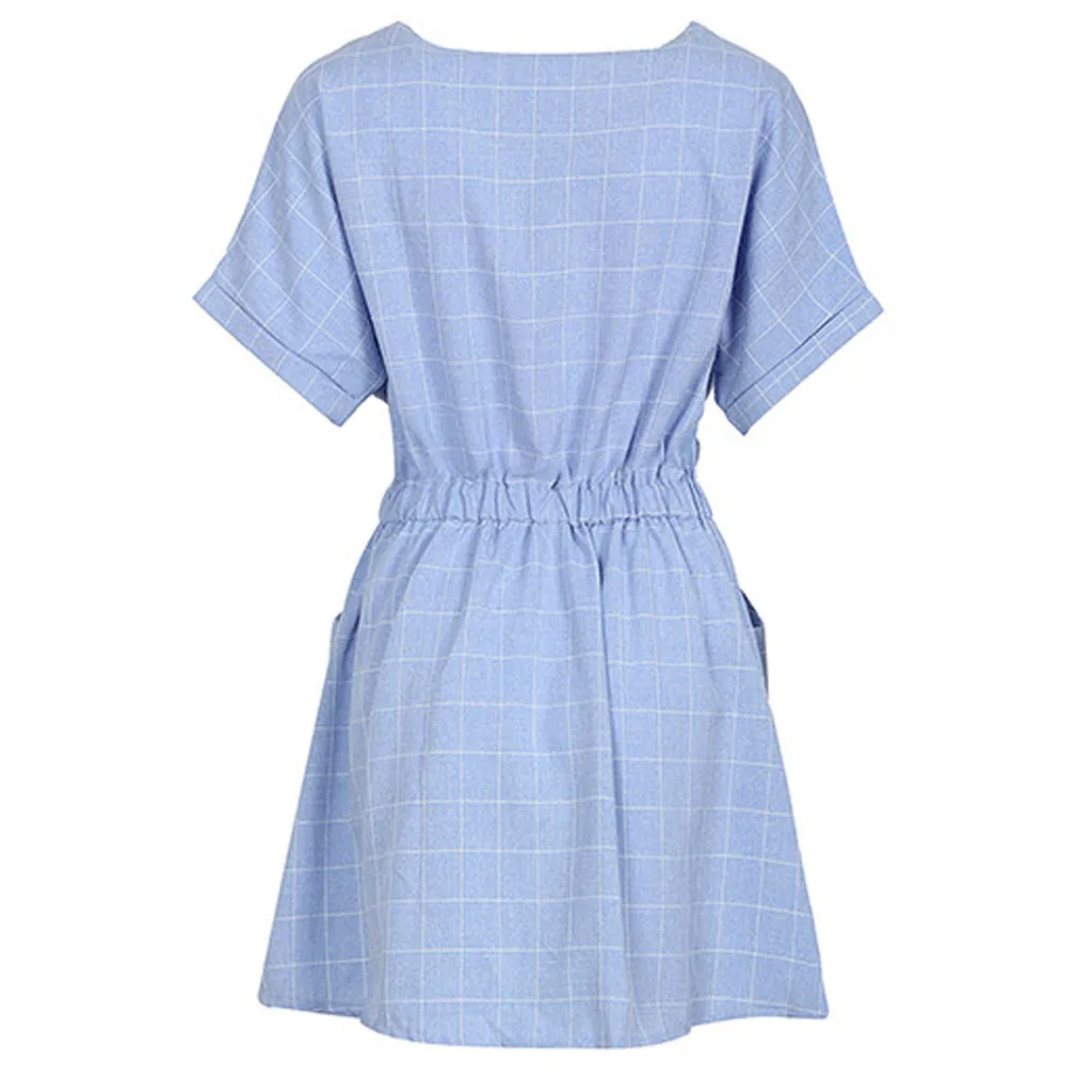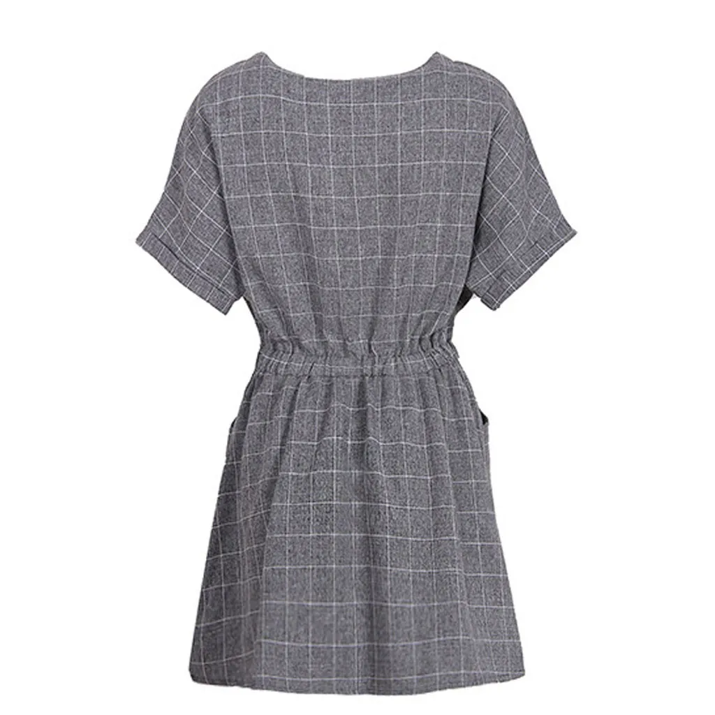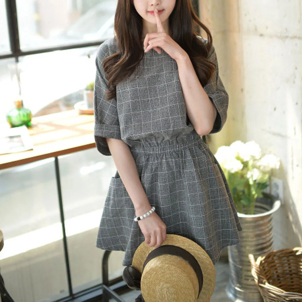 Мода женщин сплошной цвет o-образным вырезом плед платье свободное в талии Половина рукава платье
