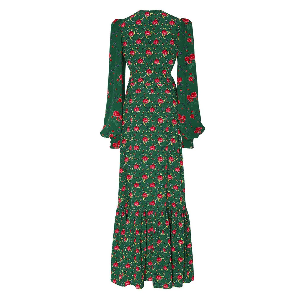 Женское винтажное элегантное вечернее длинное платье с воротником-стойкой и принтом роз с длинным рукавом