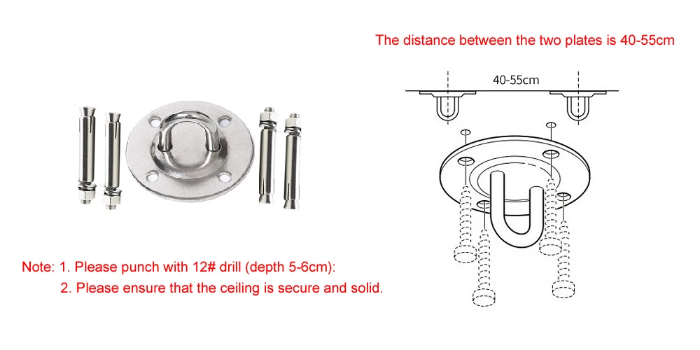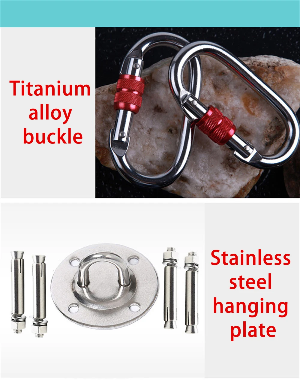 Вы можете выбрать (аксессуары): 2 * стальные карабины + 2 * удлинительные ремни (каждая длина 1 м с 6 петлями) + 2 * подвесная пластина