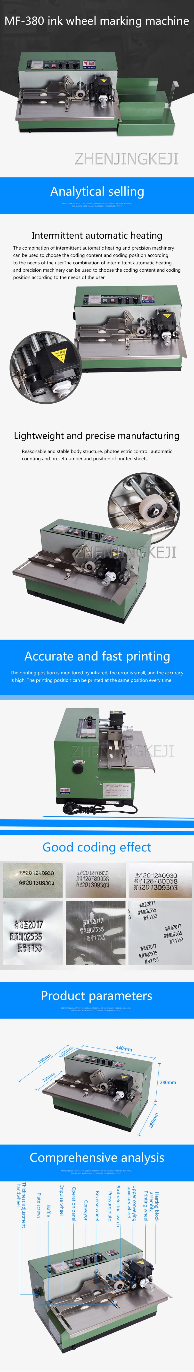 Автомат для расщепления Автоматическая подсчитывая Точное положение печати Быстрая скорость печати Регулировка кодирования Распыления под давлением Модель: MF-380 Напряжение: 220 В/50 Гц Мощность: 180 W Размер твердого чернильного колеса: 35*32 мм Скорость печати: до 300 раз/мин Ограничено мелкими принтами: 60*50 мм Ограничено для печати: 500*200 мм Количество печатных линий: 5 линий, каждая линия ограничена 11 символами Толщина печатного объекта: в пределах 1,5 мм Положение печати: регулируется в пределах 60-250 мм с одной стороны Размер Шрифт: 2-3 мм (сплошной шрифт) Размеры: 440*465*280 мм Вес: 24 кг