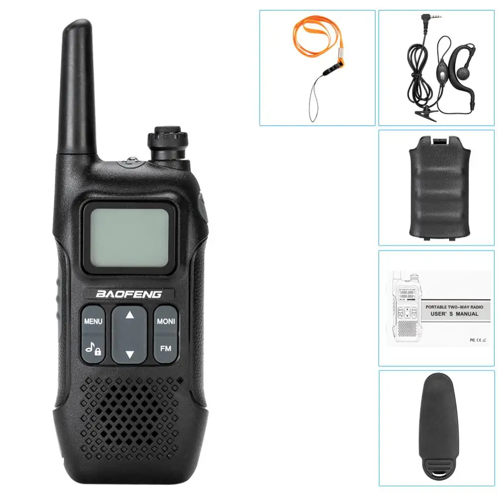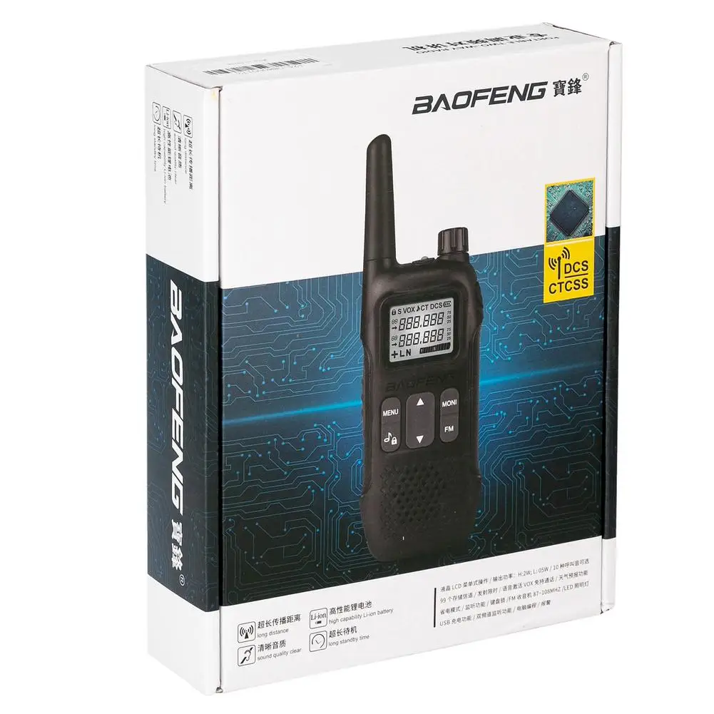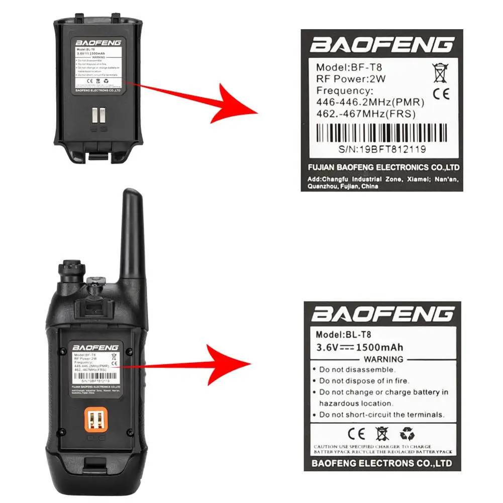 В комплект входит: 2 x BF-T8 Radios2 x 1500mAh батареи 2 x Earphones2 x ремень Clips2 x USB кабель для зарядки 2 x USB адаптер 1 x Руководство пользователя
