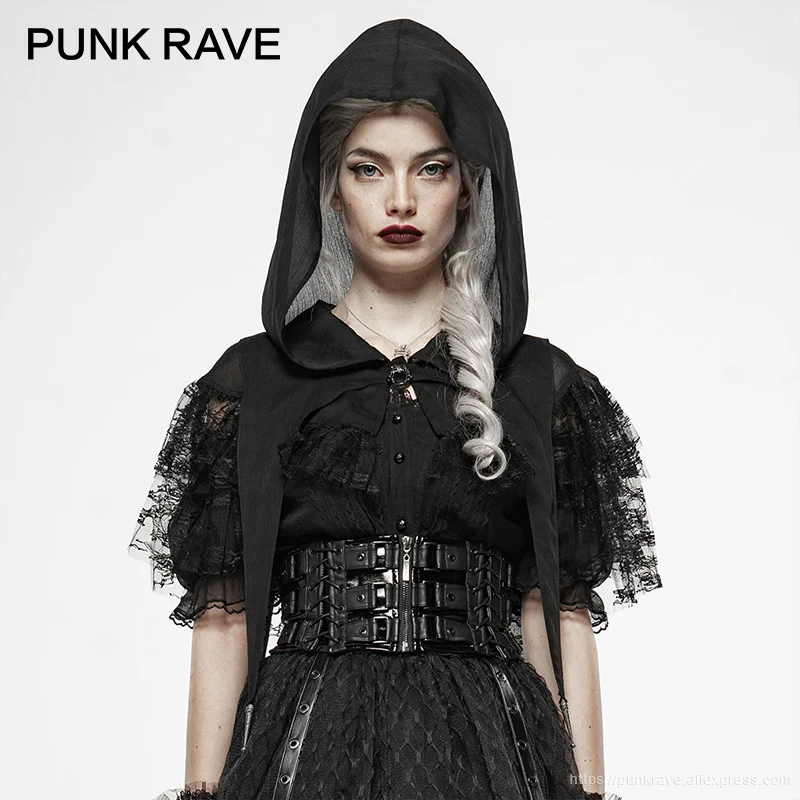 PUNK RAVE Women's Gothic Dark Magic Lace Perspective Cloak Light Chiffon Metal Buckle Loose Poncho Cape Black Women Short Coat