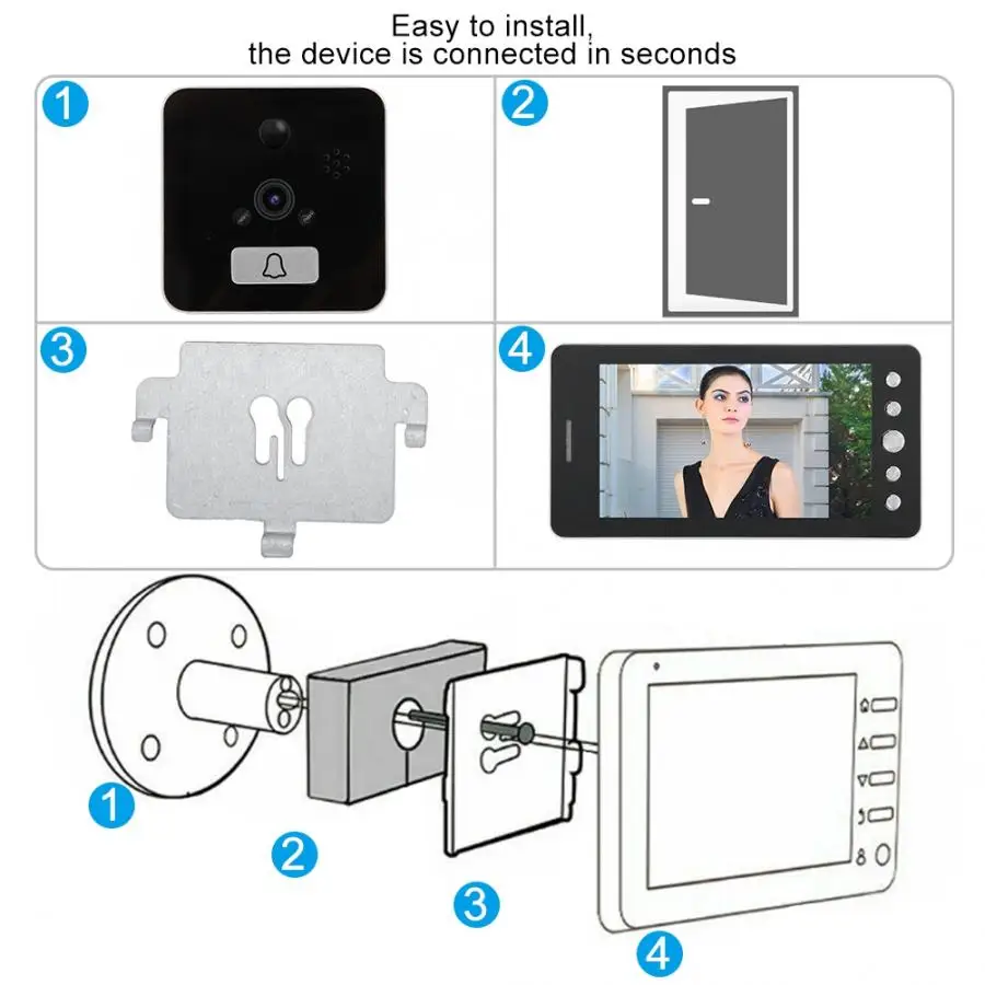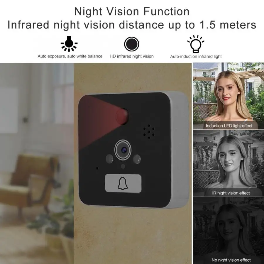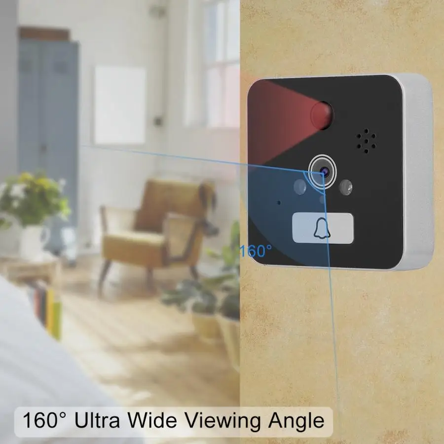 WIFI Интеллектуальный дверной глазок звонок подключен к Домашний Беспроводной роутер, который может осуществлять двусторонний мониторинг, двусторонний домофон, фотосъемку между мобильный телефон и дверной звонок. Когда Посетитель нажимает на дверной звонок, дисплей будет showns изображение. В то же время на мобильный терминал отправляется запрос на видеозвонки в режиме реального времени, и пользователь может немедленно просмотреть посетителя и позвонить в видеозапись.