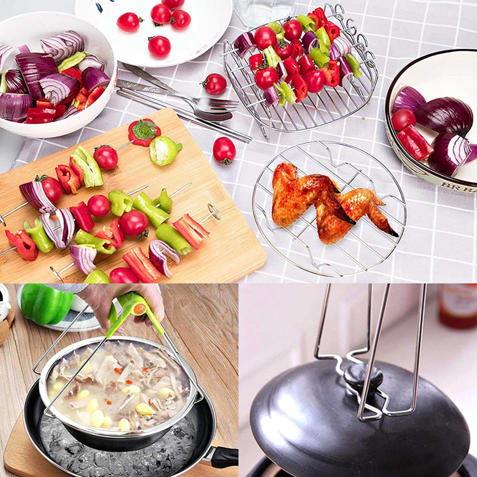 1 универсальная стойка с шампурами, 1 силиконовая щетка, 1 силиконовый пищевой Тонг, 1 зажим для посуды и 1 силиконовый коврик. Этого достаточно для использования.