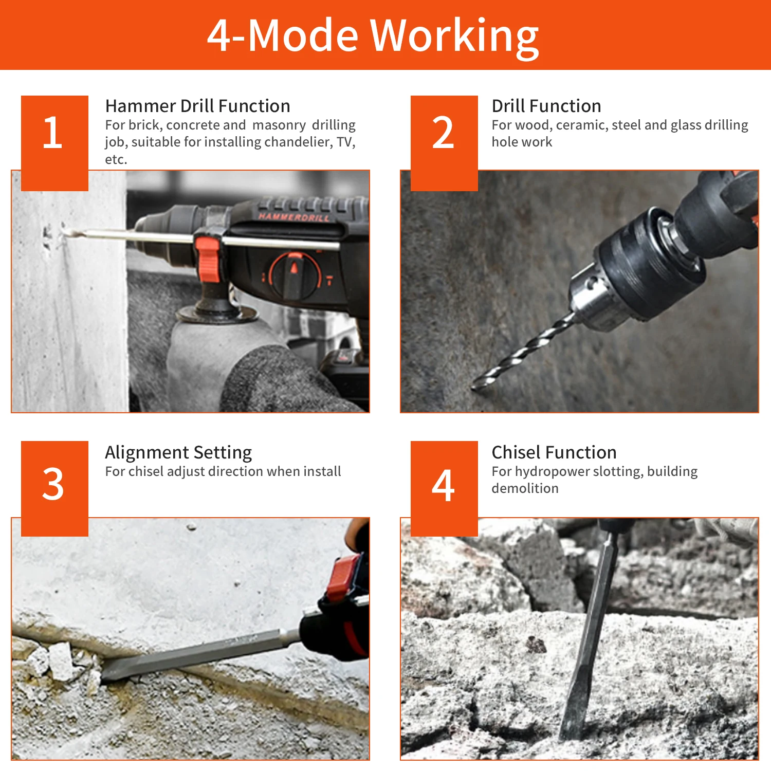 Выбор 4 режима-эта вращающаяся дрель включает в себя дрель, перфоратор, Зубило и зубило, настройки выравнивания 4 функции в 1 инструменте, экономия денег, экономия времени и повышение эффективности.