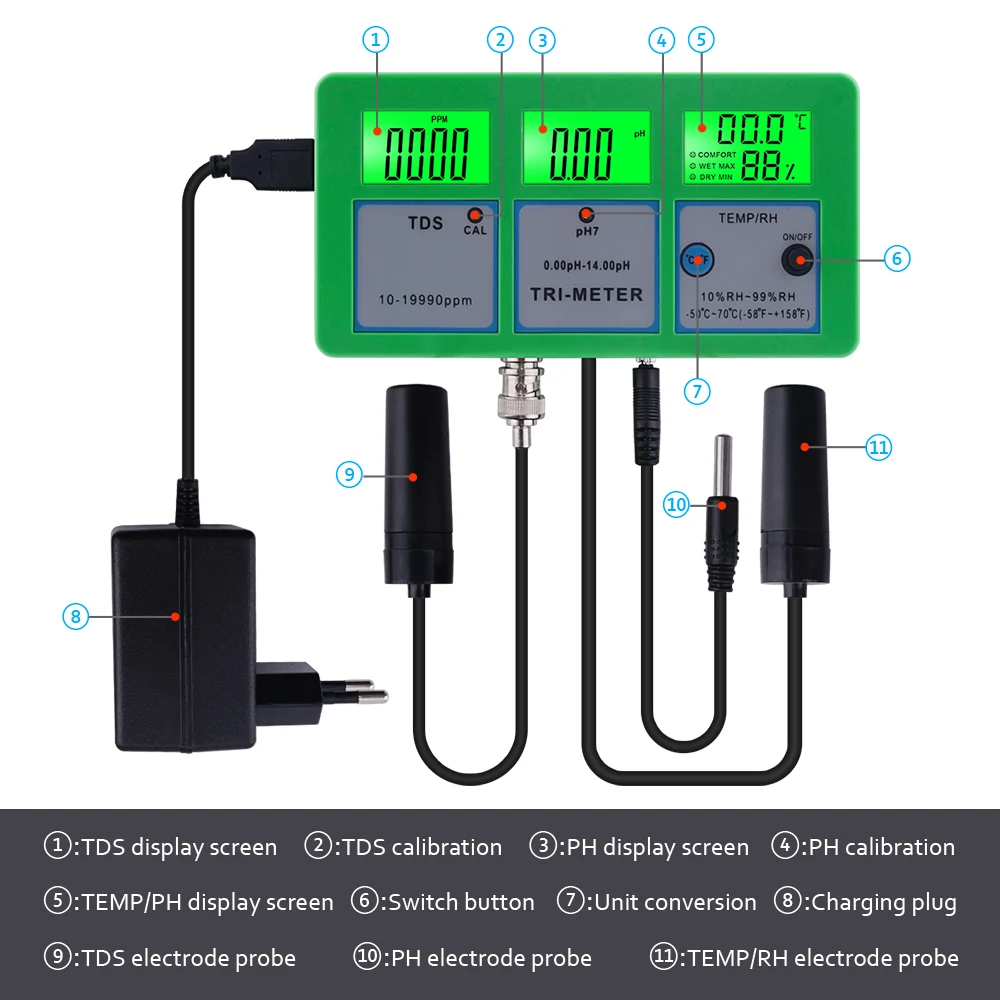 Особенности: Широко используется для измерения pH / RH/температуры/проводимости EC(TDS) раствора и воды. Импортная интегральная схема и высокая стоимость. Электродный зонд может быть заменен. Температура теста в ° / ° (переключаемый блок). Простая Калибровка pH и TDS с помощью всего мини-отвертки. Может проводить онлайн-мониторинг в течение длительного времени. Может работать непрерывно более 10 часов отключения электроэнергии или вне помещения без питания после зарядки аккумулятора в течение 3 часов. Сертификаты CE и FCC для более безопасного и точного измерения. Четкий ЖК-дисплей с подсветкой, 4 результата отображаются одновременно. Применяется в водных источниках, беспочвенном выращивании, аквариуме, гидропонике, лаборатории, спа, бассейнах и других водных системах. Автоматическая компенсация температуры. Прост в использовании и обеспечивает мгновенное отображение результатов.