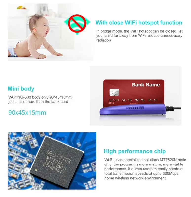 VAP11G-300 является экологически безопасным ретранслятором сигнала WiFi. Работает в режиме ретранслятора, VAP11G-300 можно увеличить вдвое, чтобы расширить исходное покрытие сигнала WiFi, обеспечивая безопасность беспроводного сигнала, и его принцип работы: размещая VAP11G-300 на краях оригинального покрытия сигнала Wi-Fi hot spot, VAP11G-300 может получить слабый сигнал WiFi, И затем Увеличьте до нормальной, безопасной прочности, и после оптимизации, обработка коррекции ошибок, для достижения покрытия сигнала расстояние удваивает расширение под безопасным.