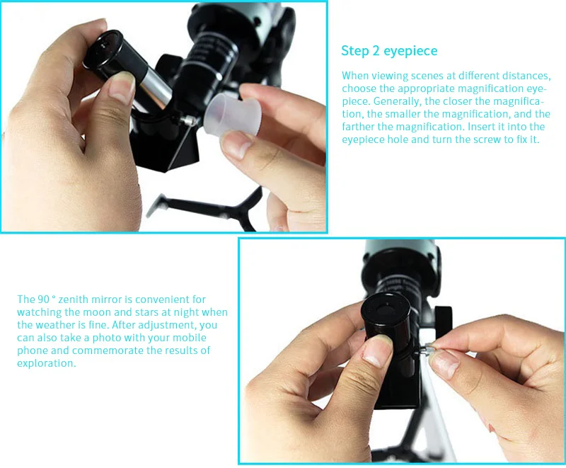 Фокусное расстояние составляет 300 мм, а калибр-70 мм. Он оснащен двумя окулярами: H6 (для дневного просмотра) и H20 (для ночного наблюдения за луной), он также оснащен 3х линзами Barov и ортографическим объективом 1,5x и лунным объективом. Наклейка луна-зеркало: поскольку при наблюдении за полнолуной имеется много помех, отражающих светильник, с помощью наклейка луна-зеркало может устранить эти помехи и сделать поверхность луны более прозрачной. При использовании, пожалуйста, прикрутите линзу луны в нить на нижней части окуляра, а затем подключите окуляр к объективу zenith.
