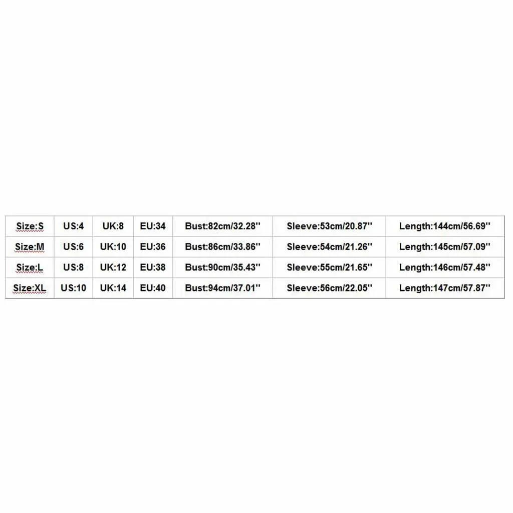 Size US UK EU Bust Sleeve Length S 4 8 34 82cm/32.28'' 53cm/20.87'' 144cm/56.69'' M 6 10 36 86cm/33.86'' 54cm/21.26'' 145cm/57.09'' L 8 12 38 90cm/35.43'' 55cm/21.65'' 146cm/57.48'' XL 10 14 40 94cm/37.01'' 56cm/22.05'' 147cm/57.87''