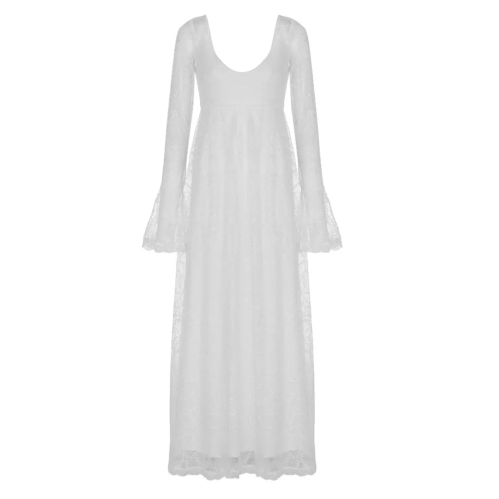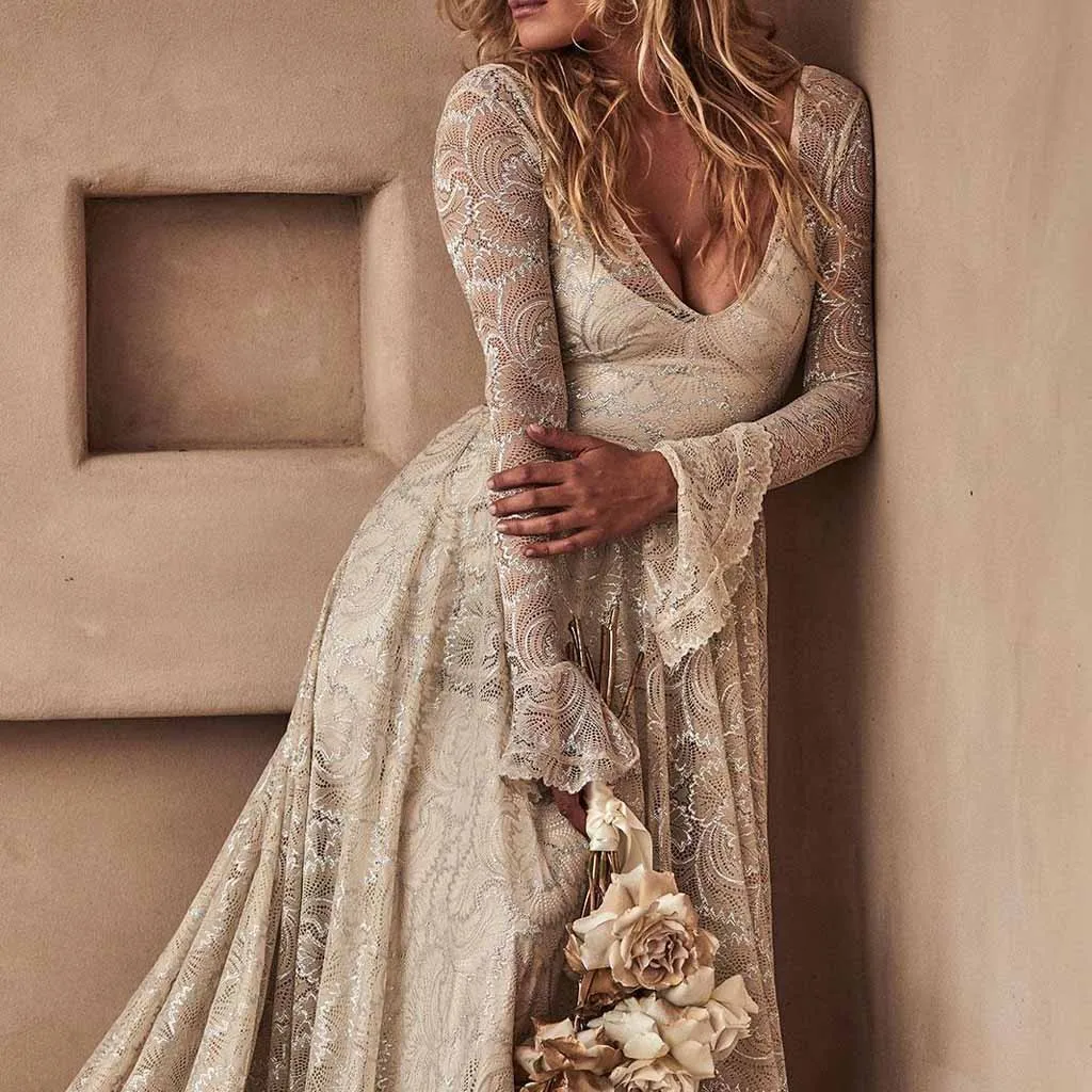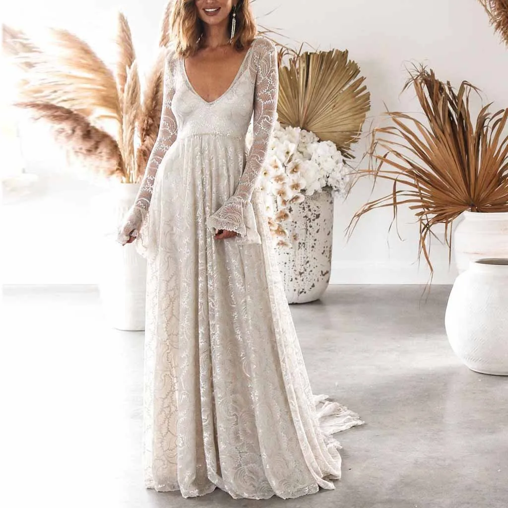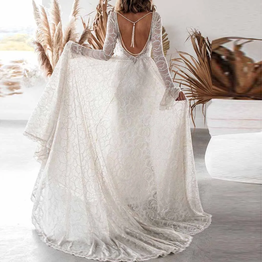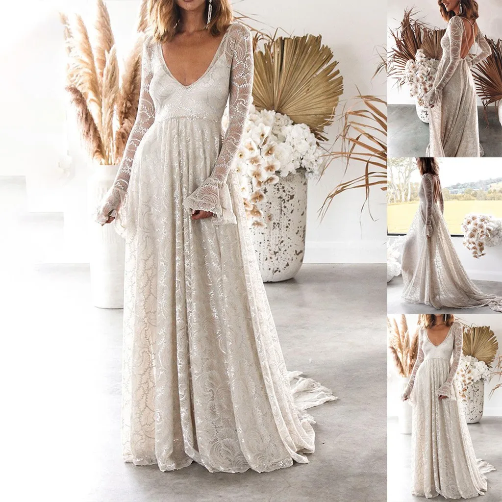 Модные женские туфли на каждый день, v-образный вырез, длинный рукав, кружевное платье с открытой спиной Вечерние платья