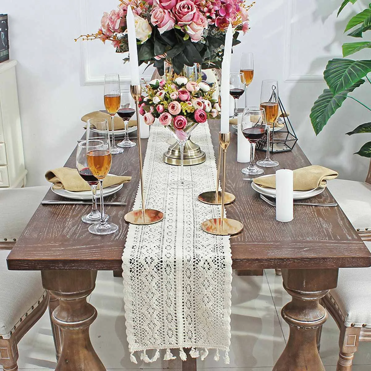 Бежевые кружевные скатерти с кисточками, свадебные украшения, вечерние скатерти